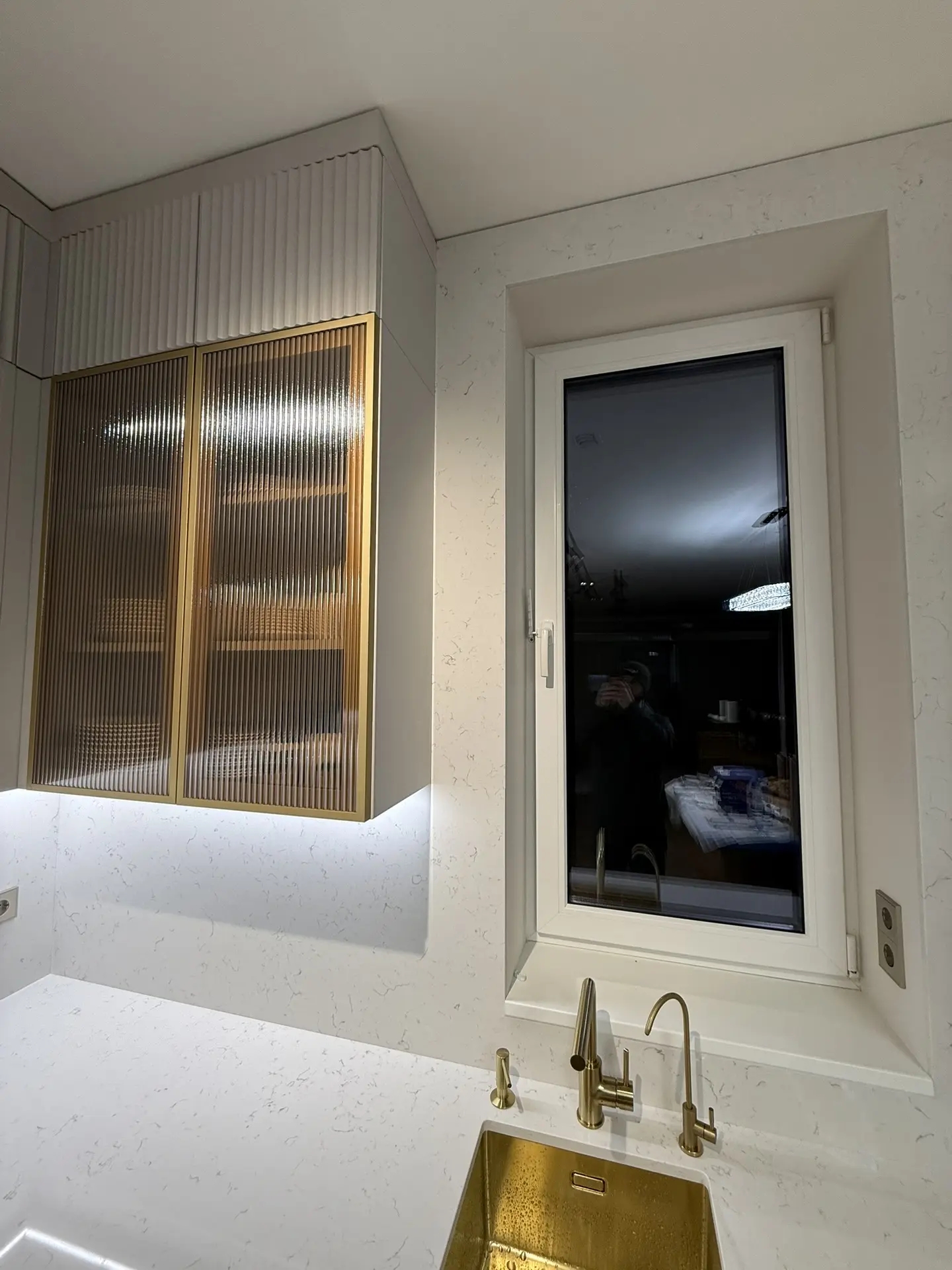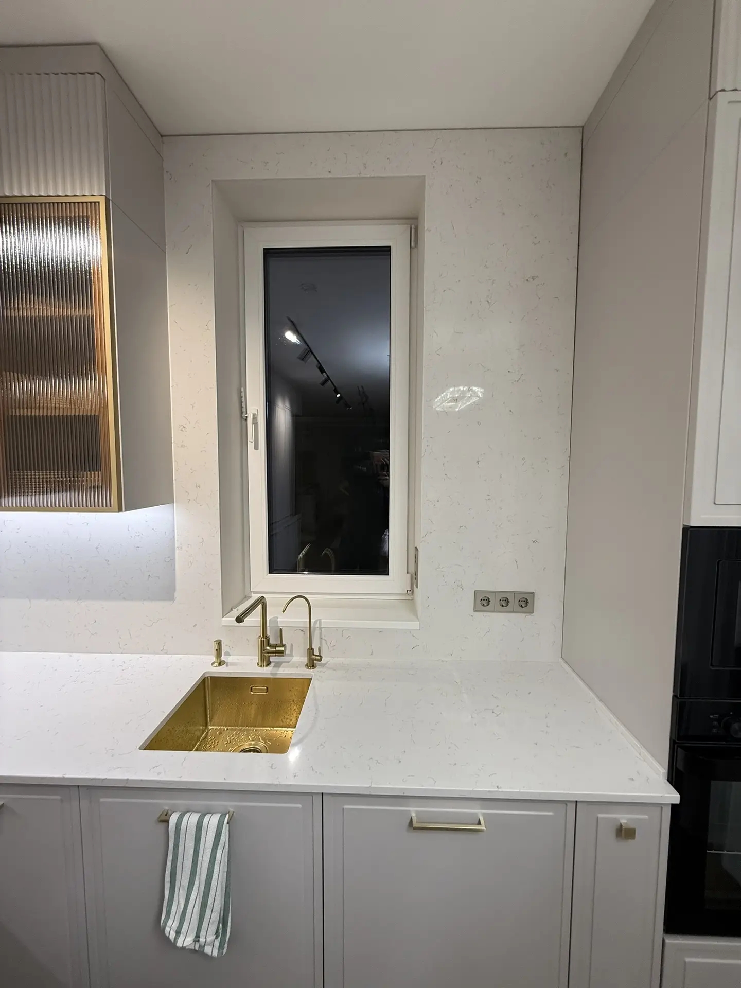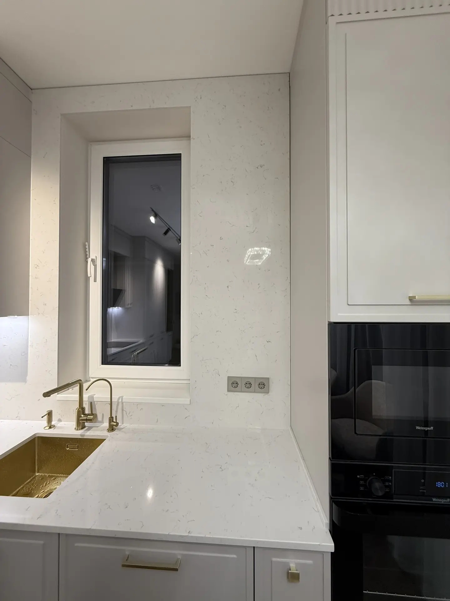 Ещё одно оригинальное решение дизайнера. Стеновая панель до потолка вокруг окна.Российский камень Аварус R520 (Астраханские пески).