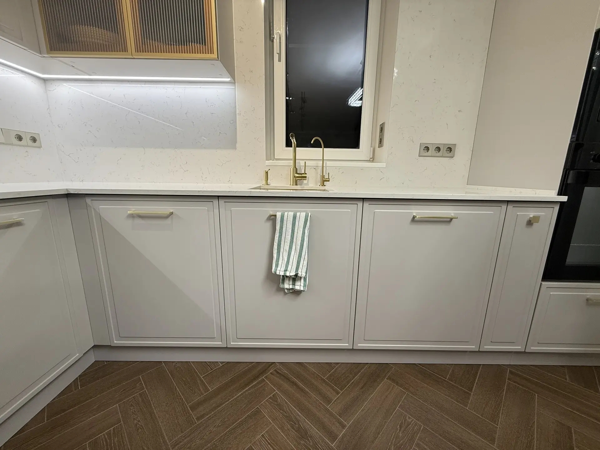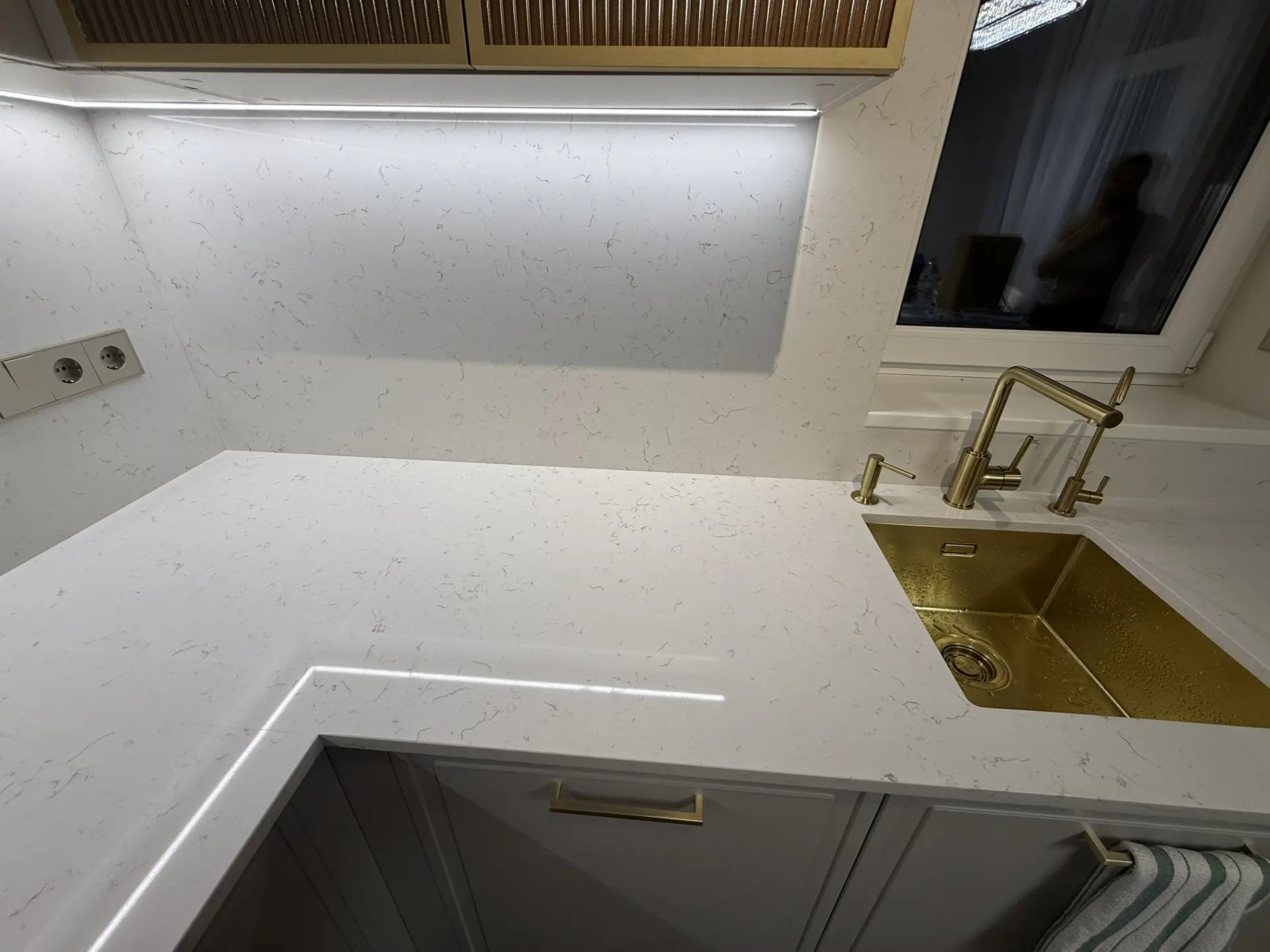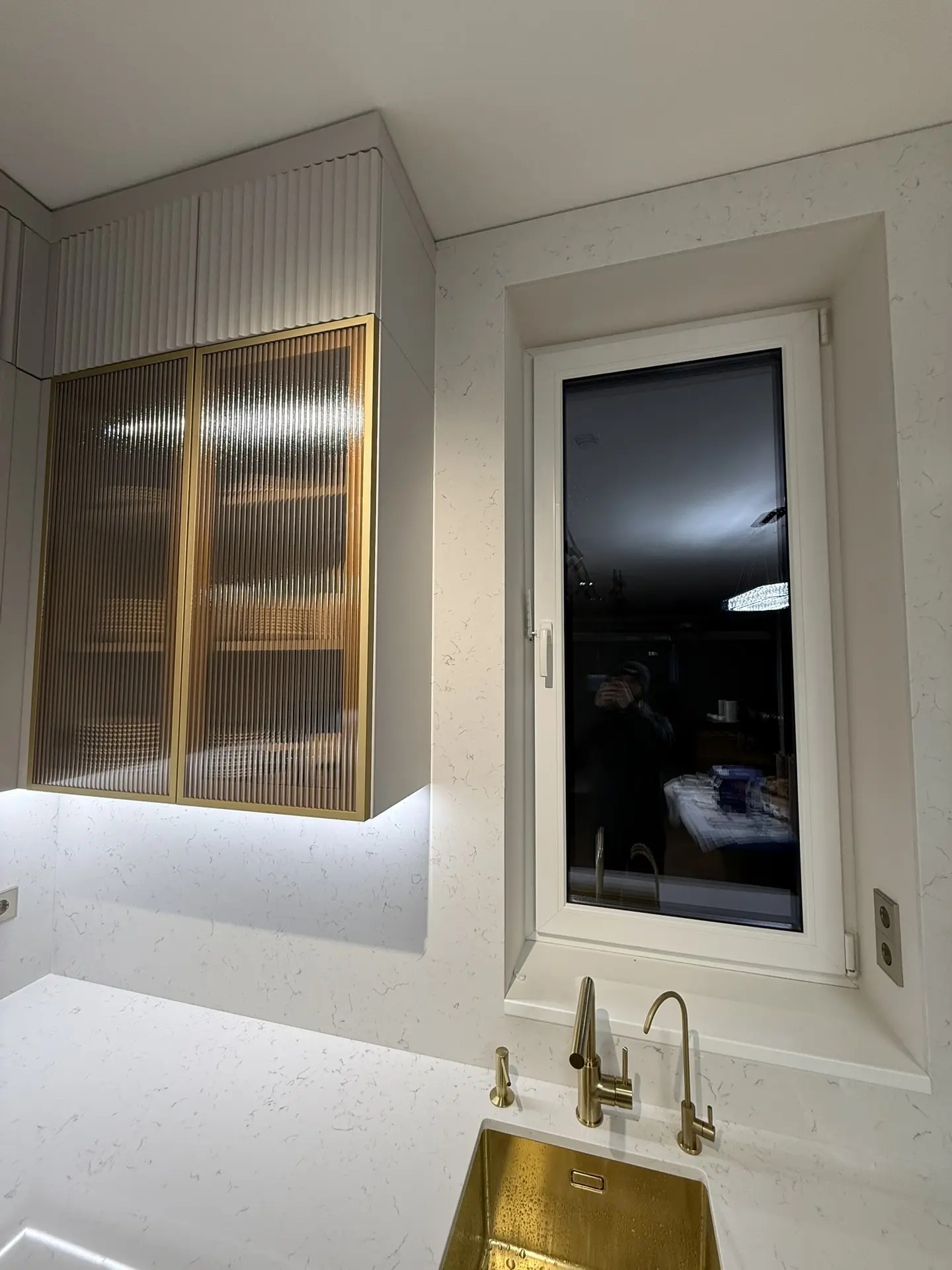 Ещё одно оригинальное решение дизайнера. Стеновая панель до потолка вокруг окна.Российский камень Аварус R520 (Астраханские пески).