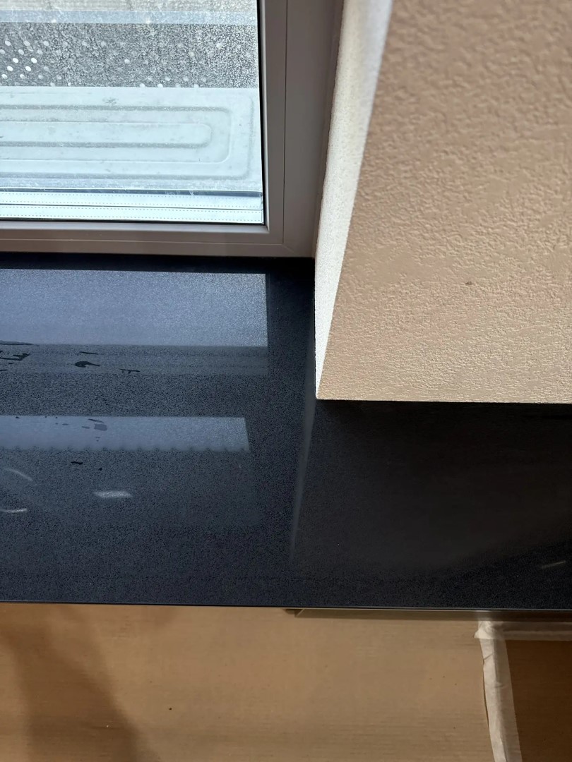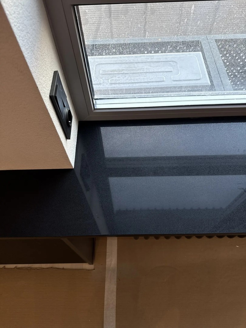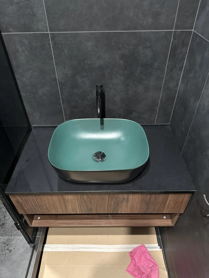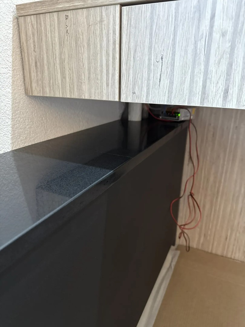 Для разнообразия. Чёрная столешница на тумбу вдоль всей стены. И небольшой мойдодыр в ванную комнату из того же камня.