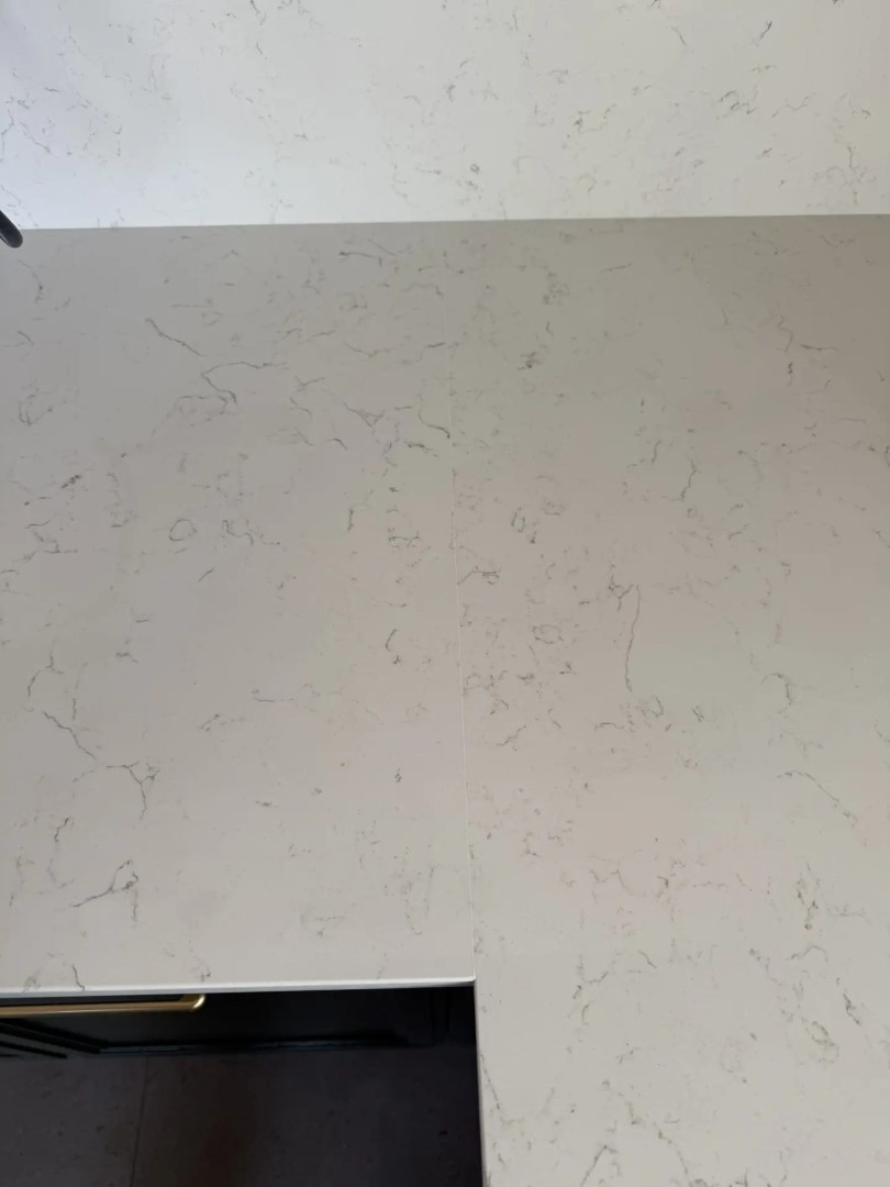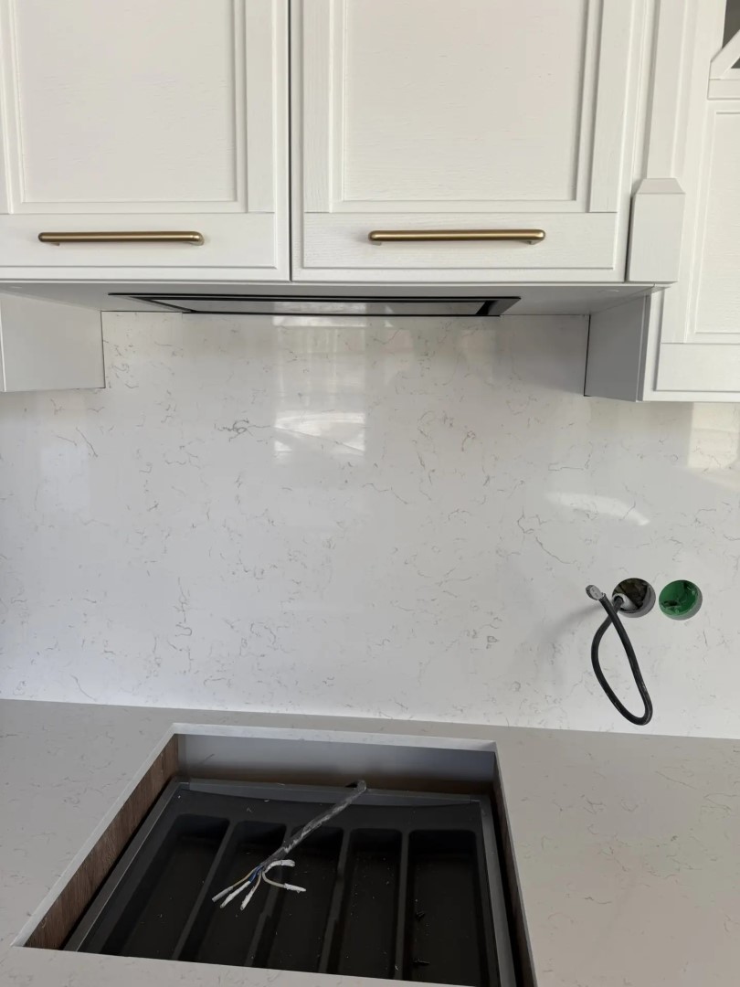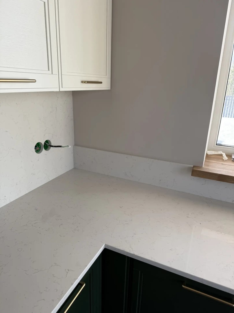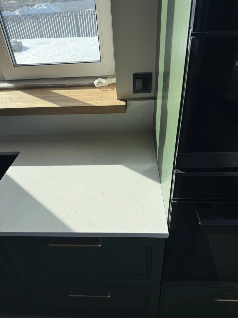 Столешница, стеновые панели разной высоты, остров из российского кварцевого агломерата Аварус R520 Астраханские пески. Нависание на острове с нижней стороны отполировали.