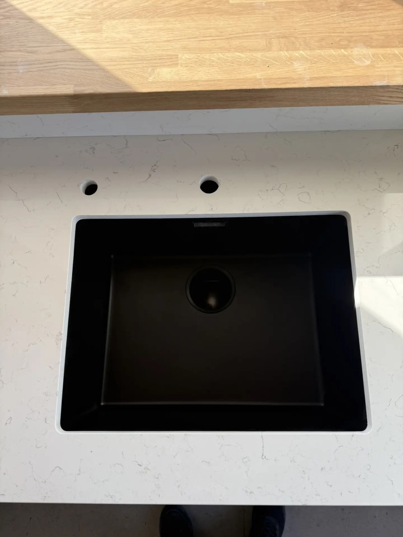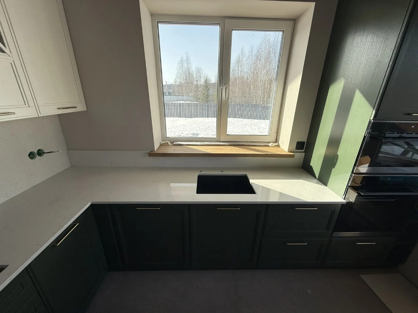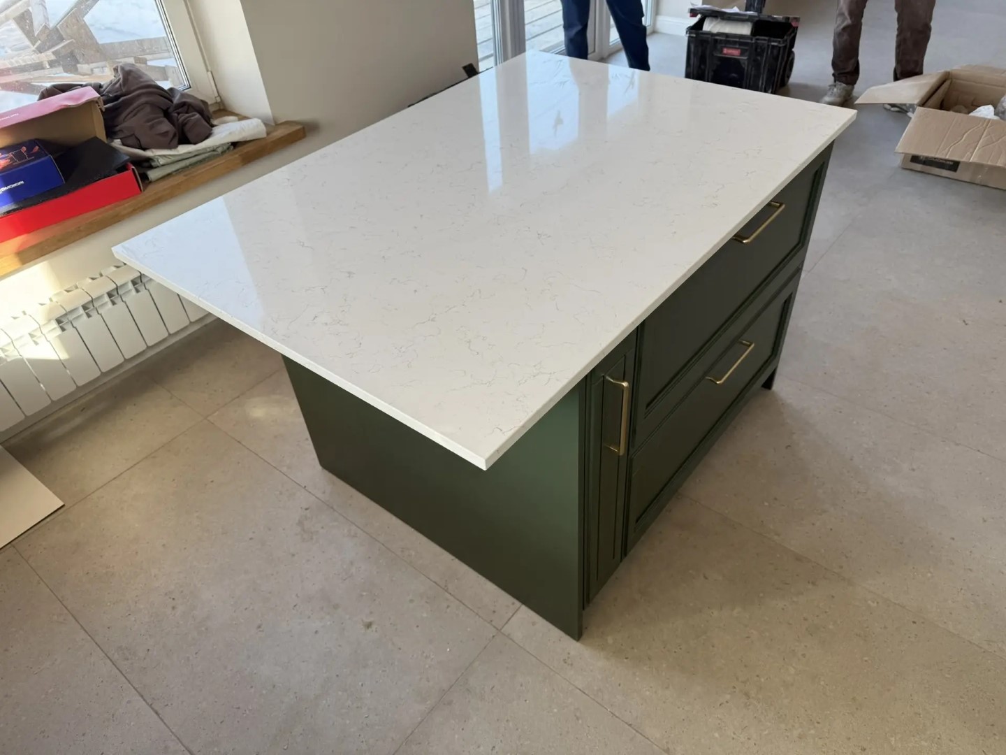 Столешница, стеновые панели разной высоты, остров из российского кварцевого агломерата Аварус R520 Астраханские пески. Нависание на острове с нижней стороны отполировали.