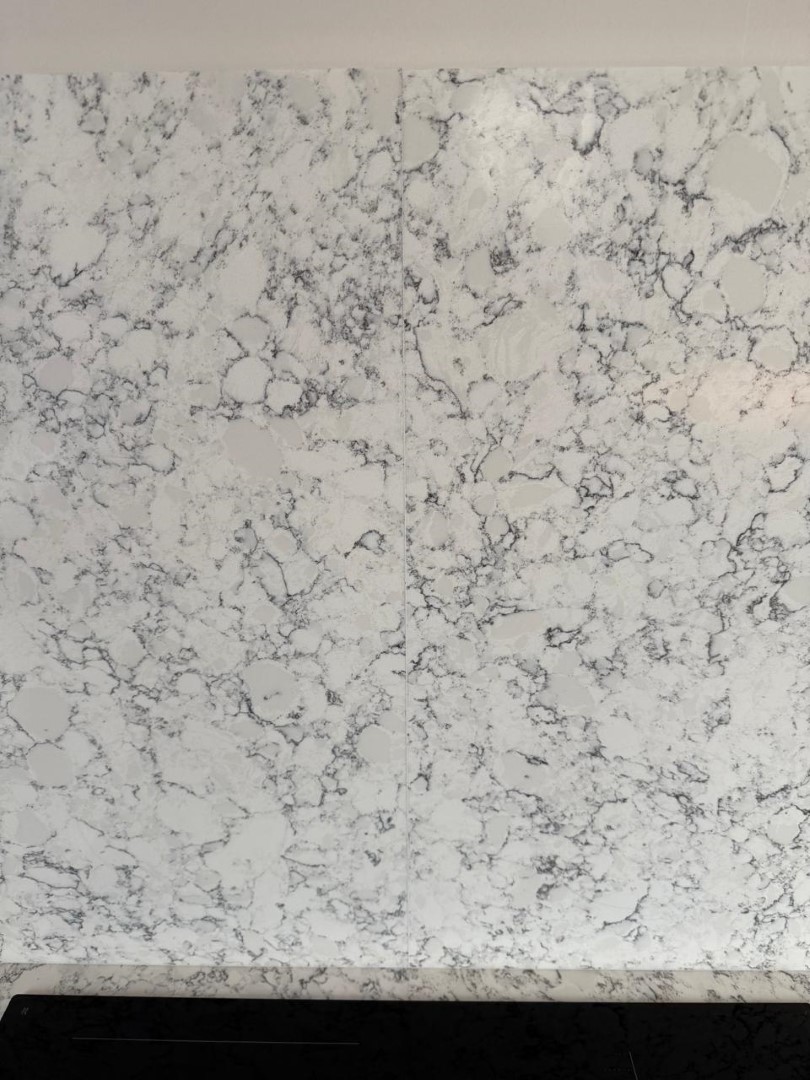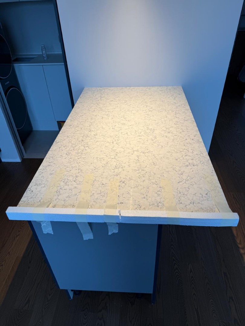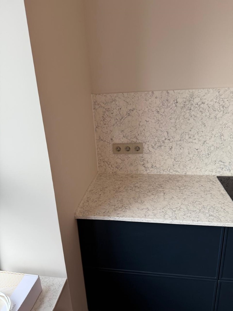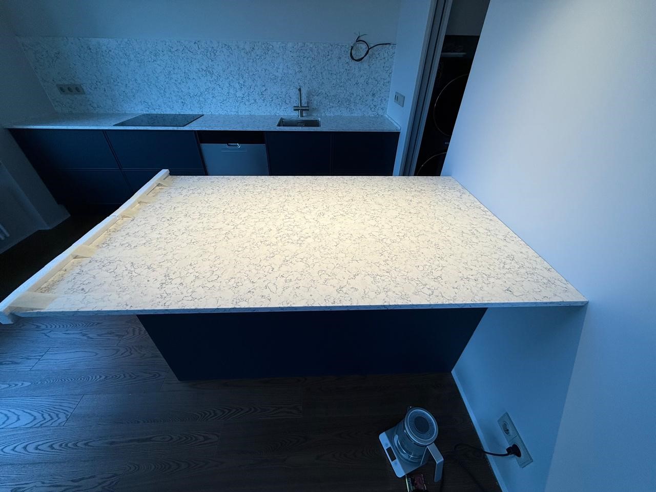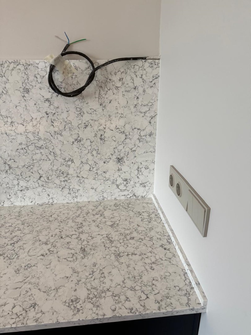 Столешница и остров толщиной 20мм с ногой, запиленной под 45* из корейского кварцевого агломерата Radianz AC711.Полку сделали толщиной 40мм, чтобы было где спрятать крепежи.