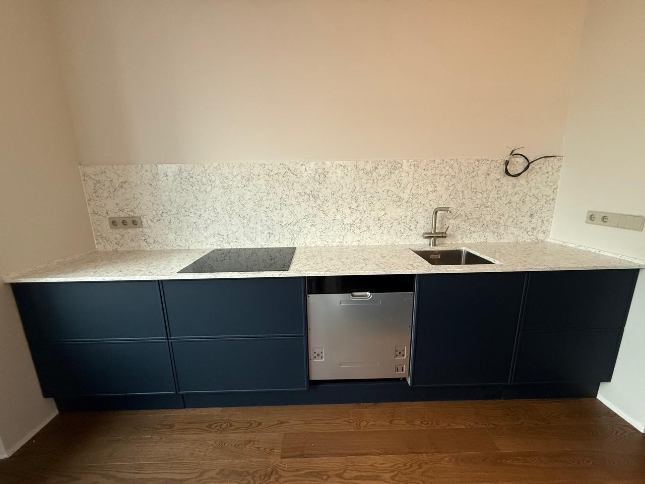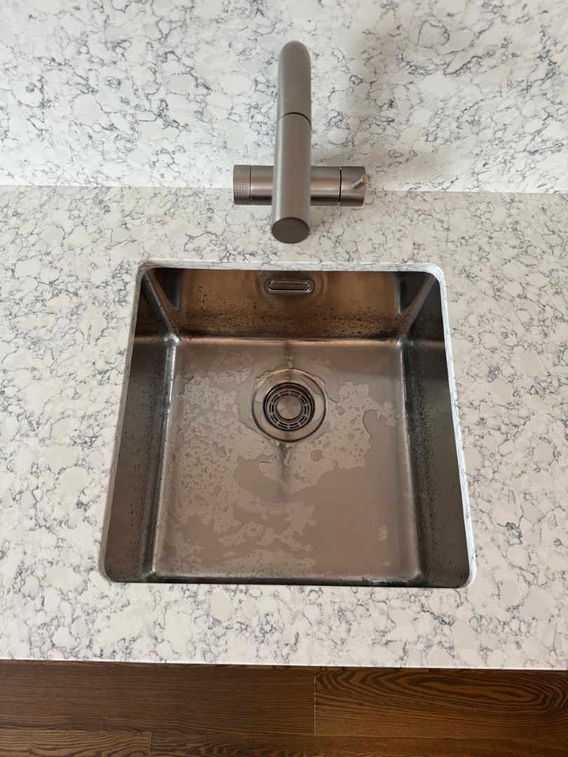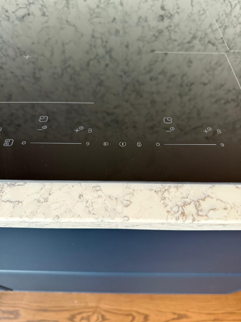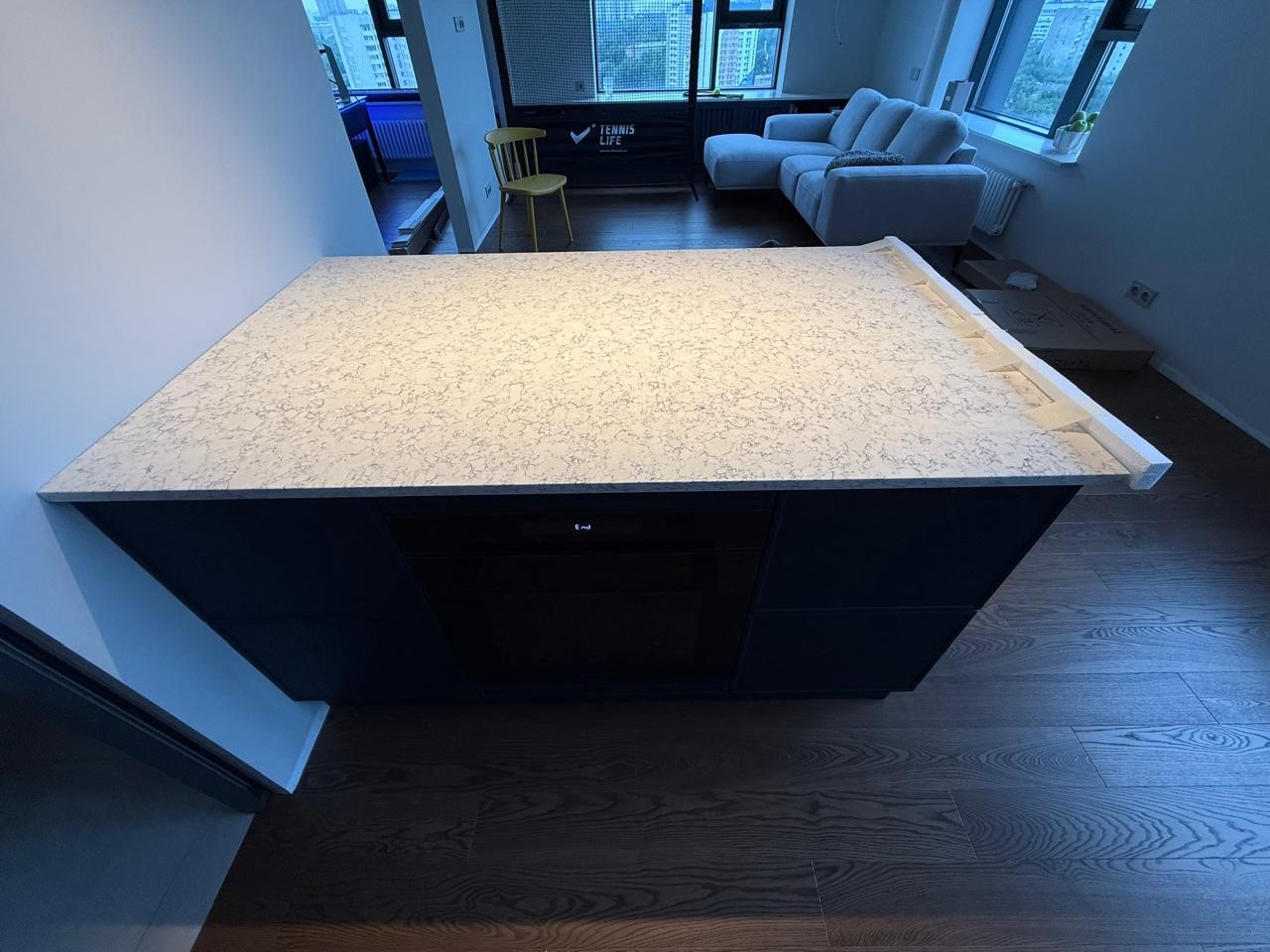 Столешница и остров толщиной 20мм с ногой, запиленной под 45* из корейского кварцевого агломерата Radianz AC711.Полку сделали толщиной 40мм, чтобы было где спрятать крепежи.