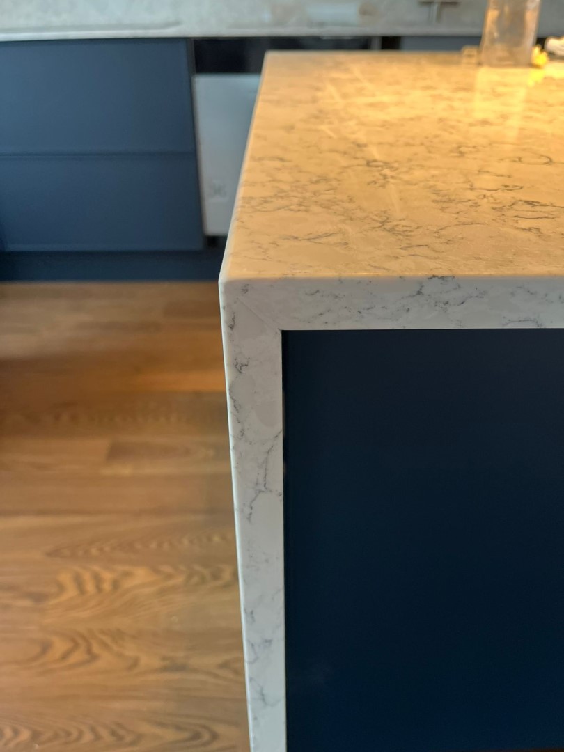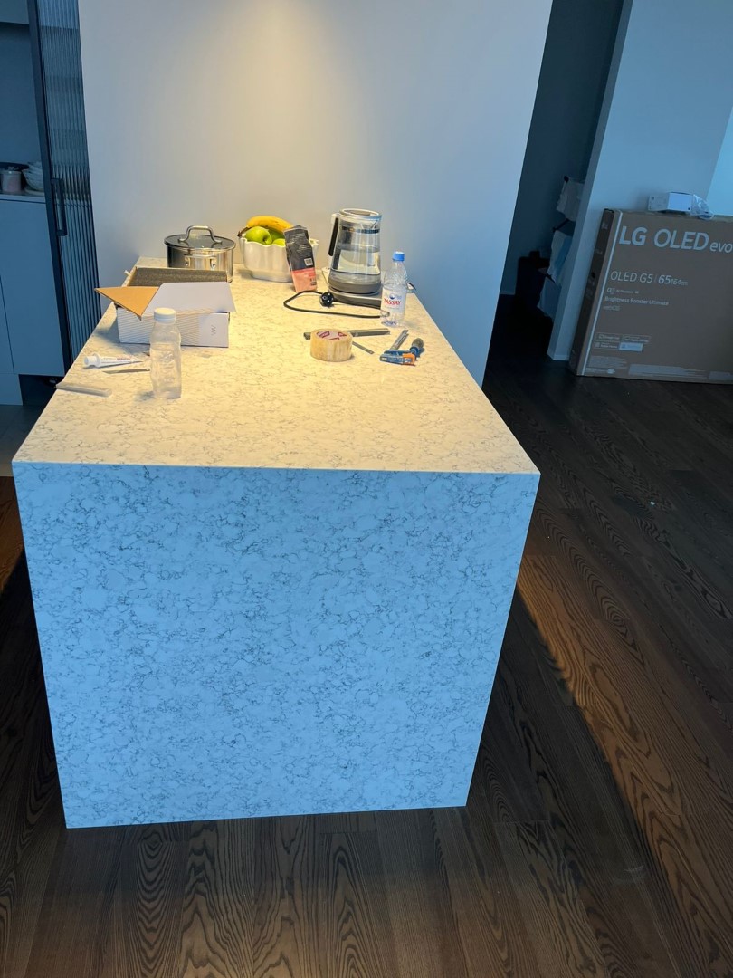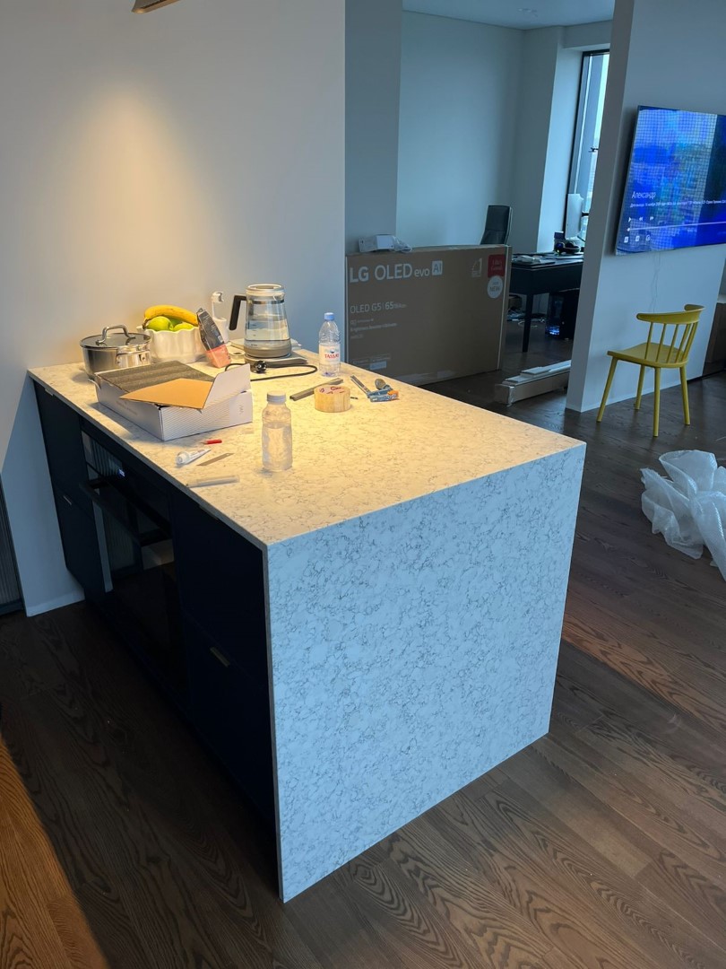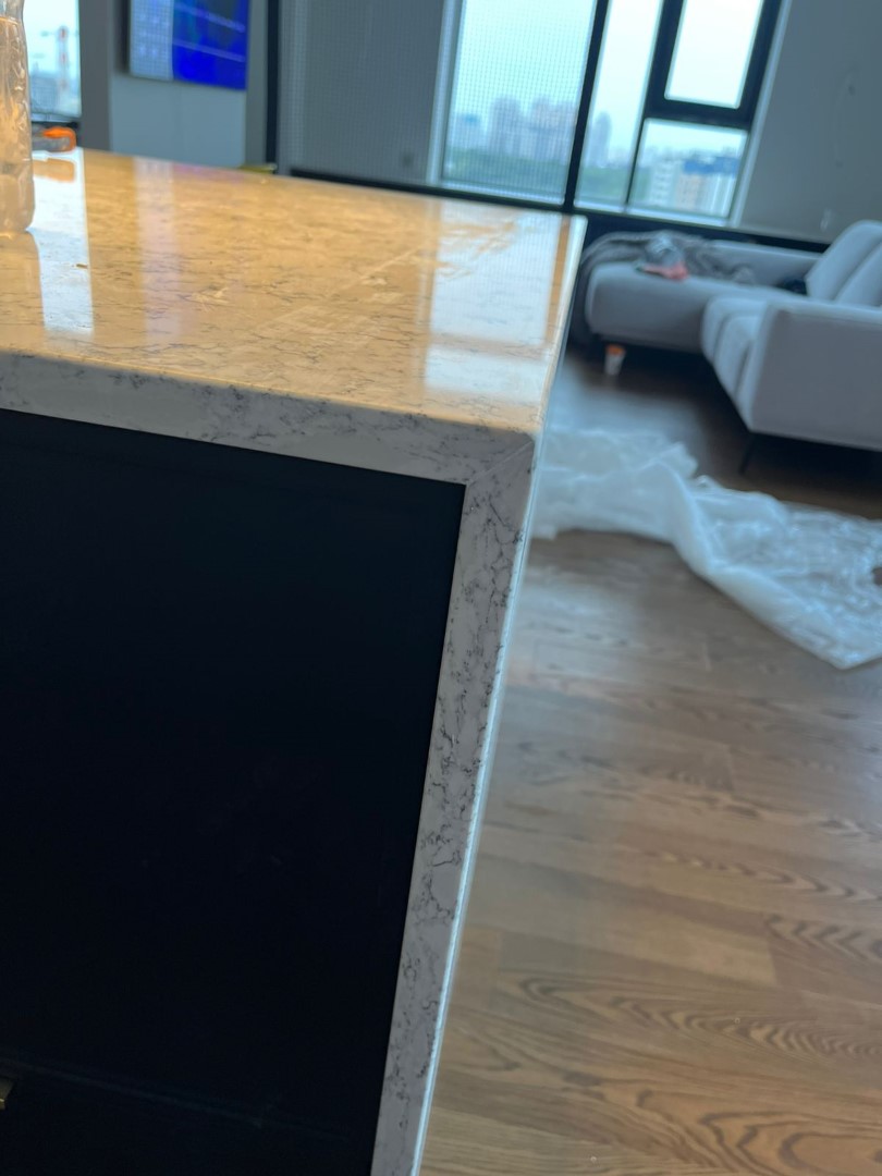 Столешница и остров толщиной 20мм с ногой, запиленной под 45* из корейского кварцевого агломерата Radianz AC711.