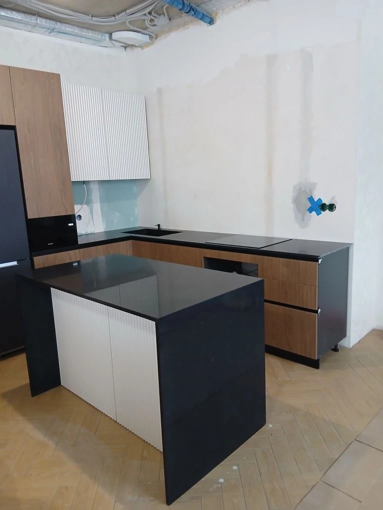 Столешница и остров из кварцевого агломерата Аварус R510 Чёрное море. Камень полированный, с мелкими прожилками под мрамор.