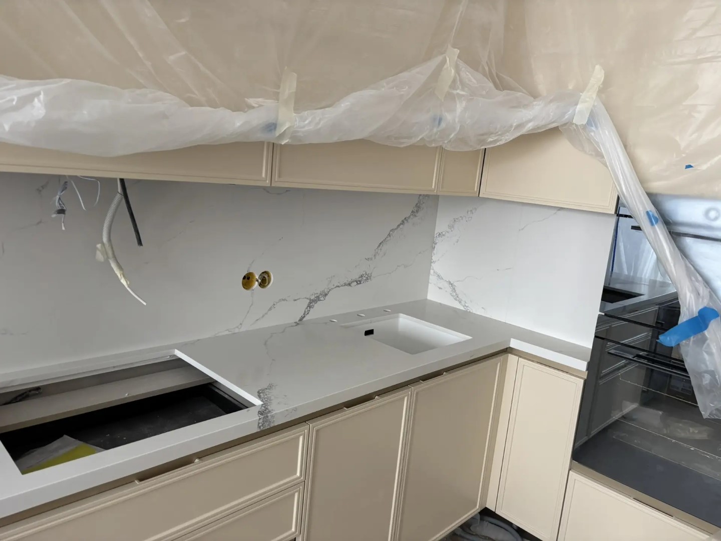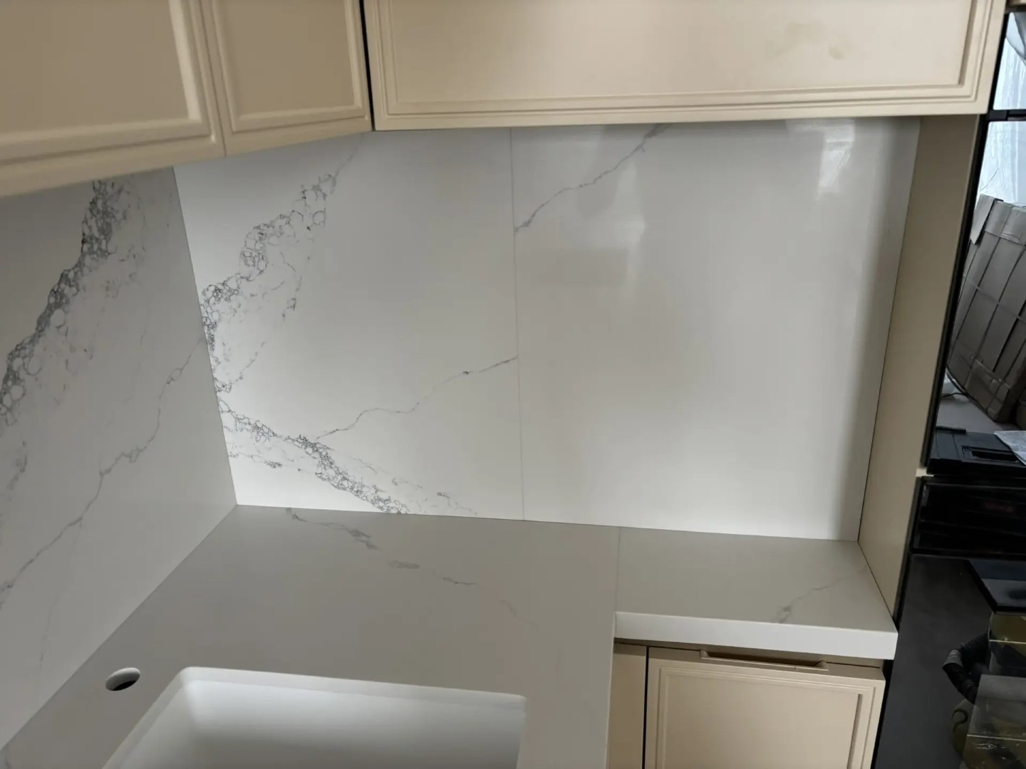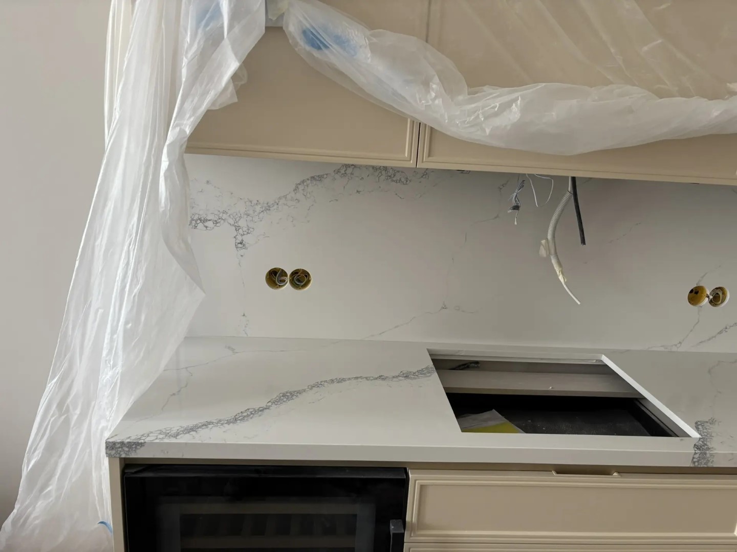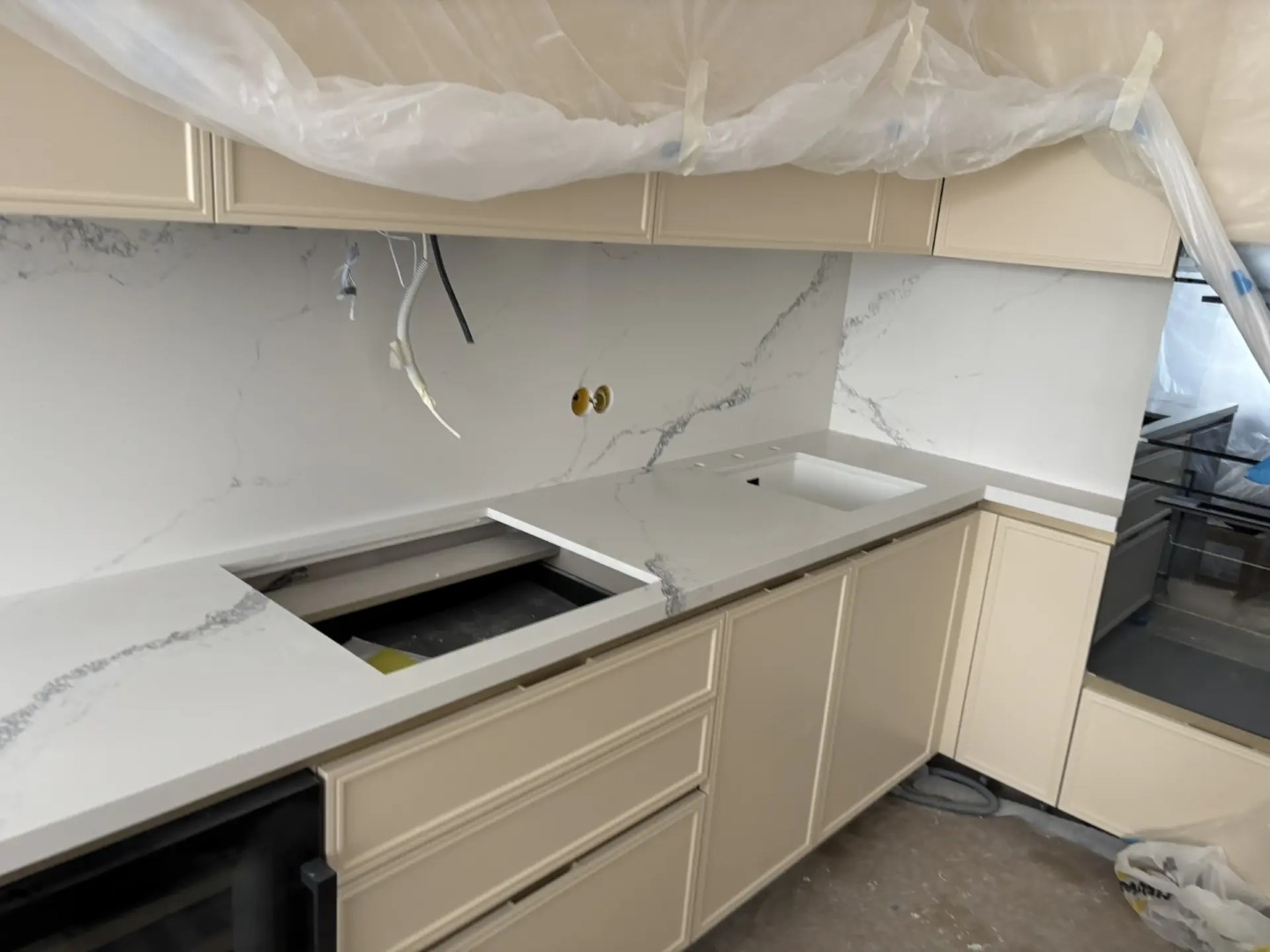Столешница и стеновая панель из относительно нового на рынке кварцевого агломерата AlephStone, артикул Statuario NG. Стеновую панель сделали потоньше, 12 мм вместо заводских 20мм, чтобы одна (более мЕньшая часть стеновой панели) могла сниматься. Мы её поставили на магнитные крепежи. Не часто такое встречается...