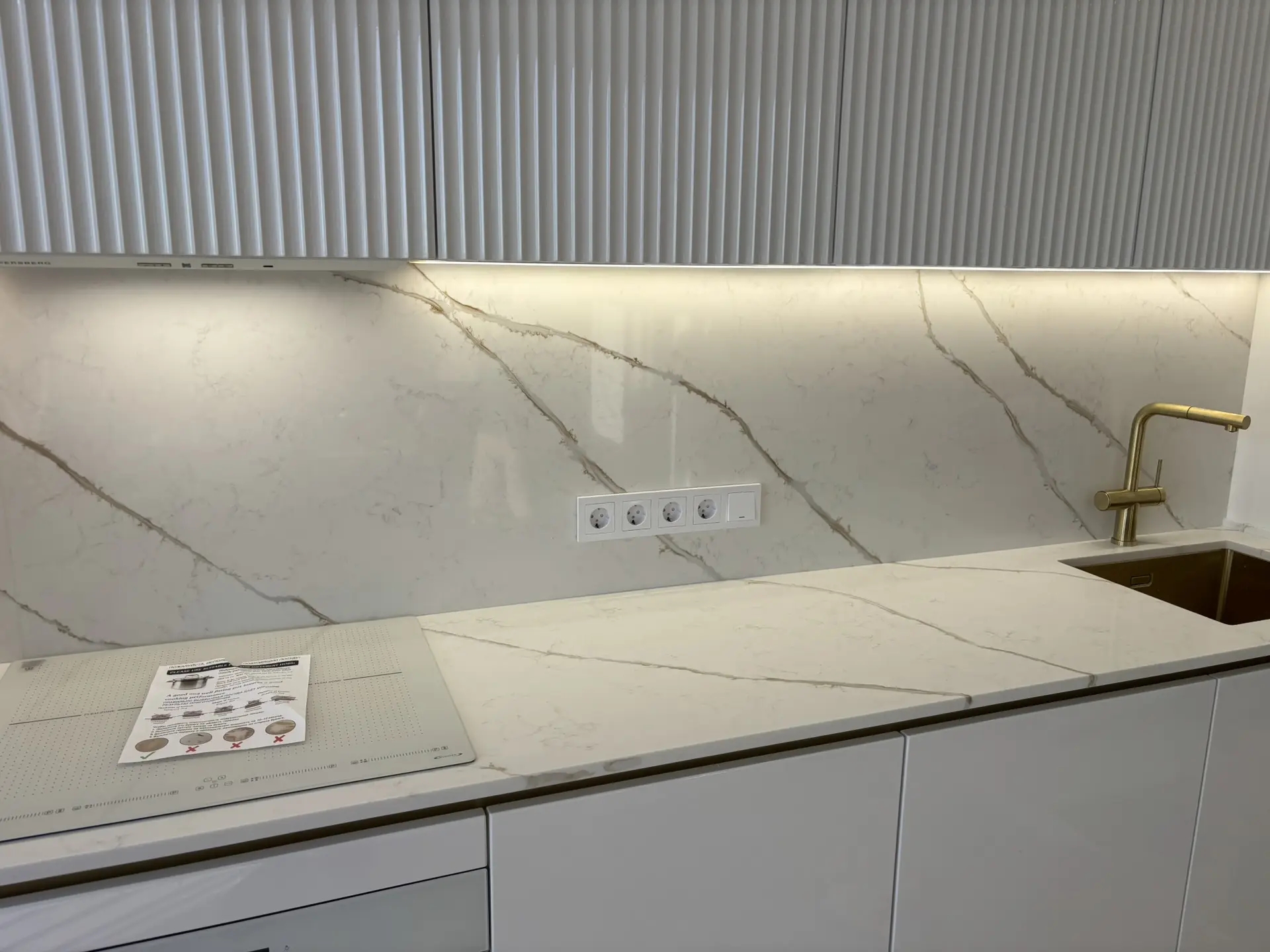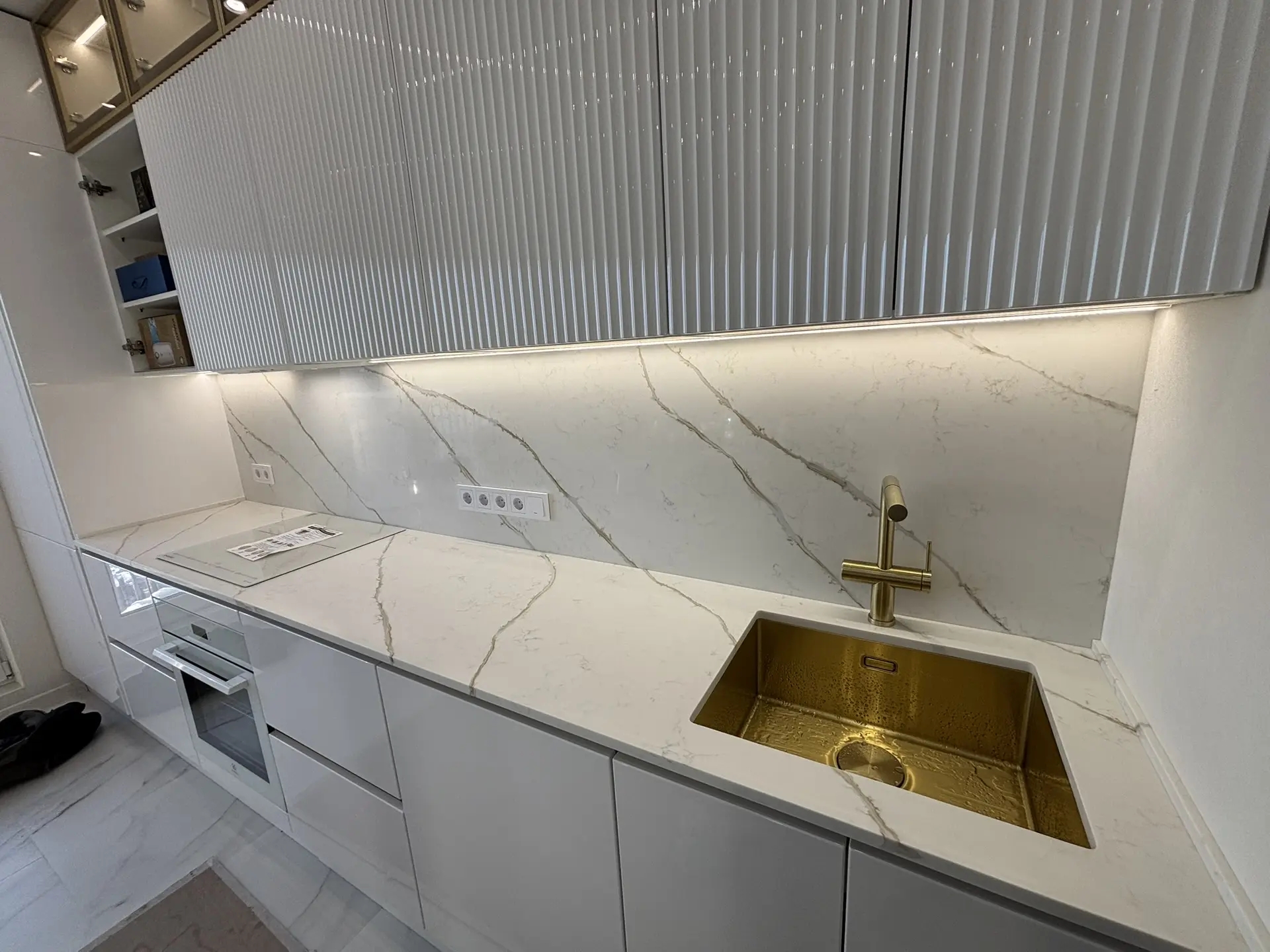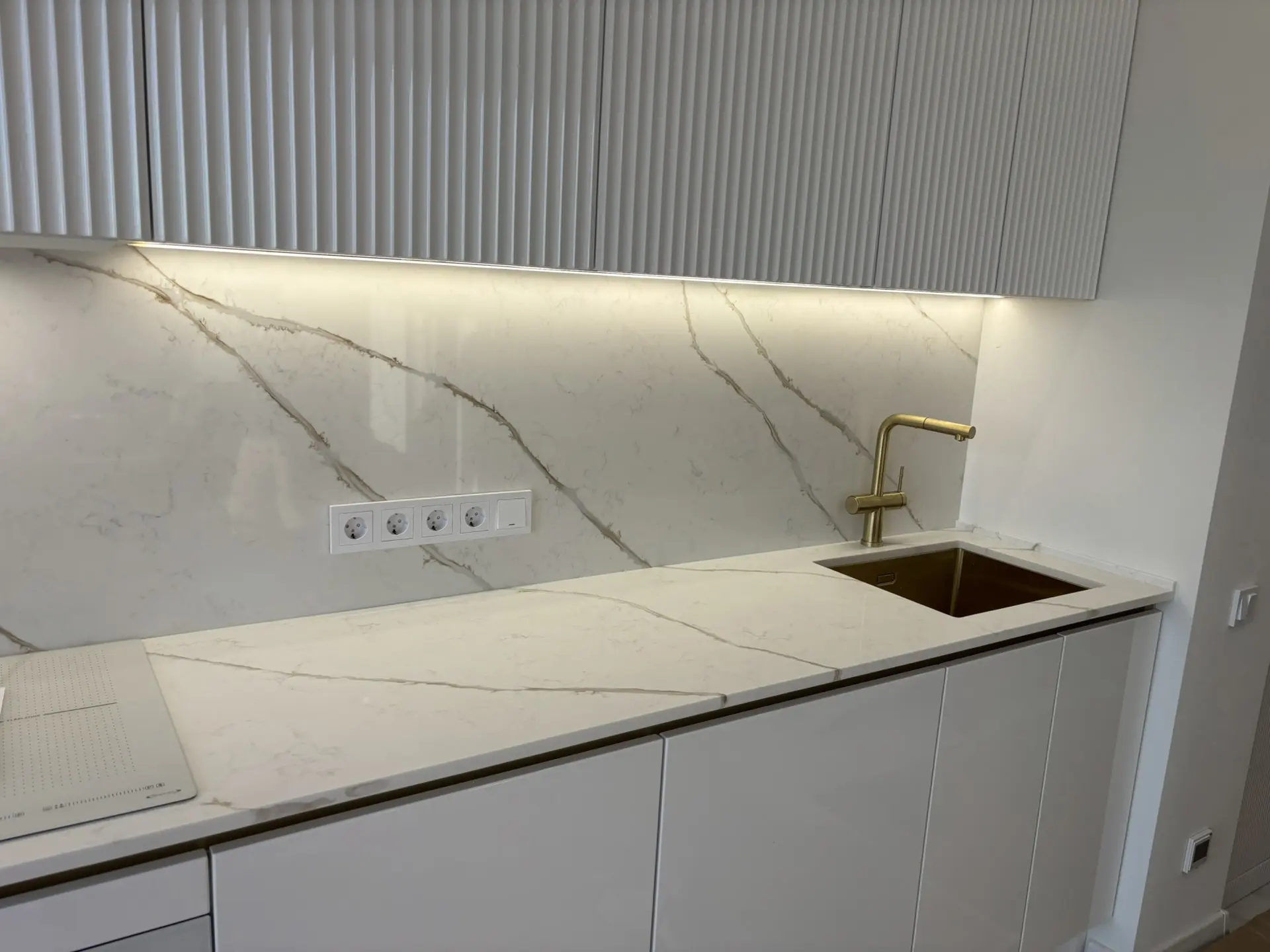 Столешница и стеновая панель из кварцевого агломерата Etna 002. Камень типа «Калакатта» (большие полосы идут по слэбу, а в изделии получается, что переходят со стеновой на столешницу (или наоборот)).