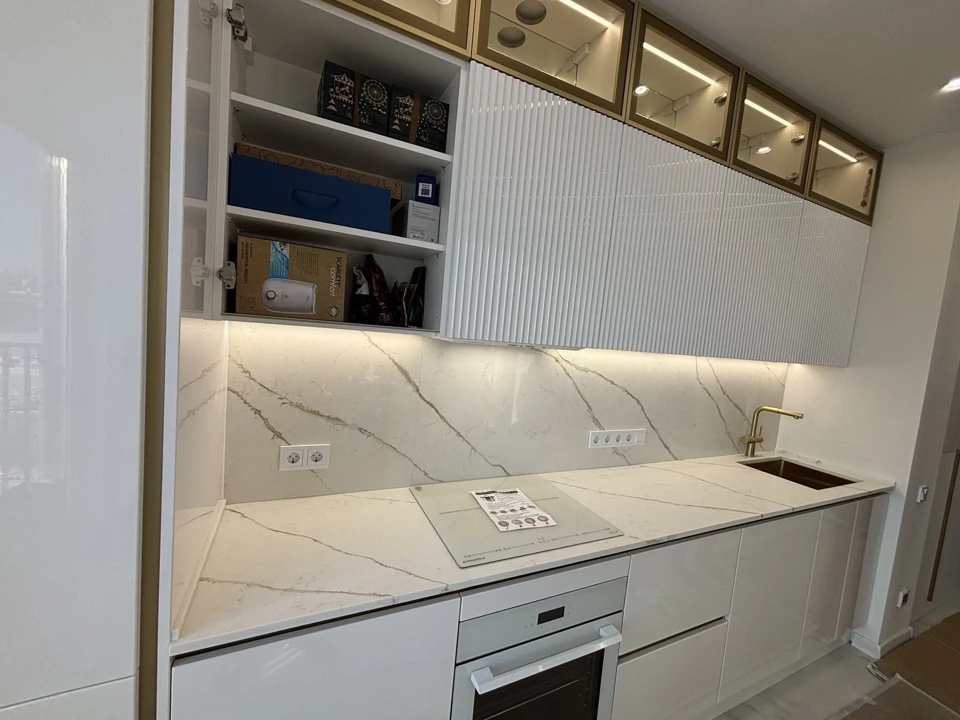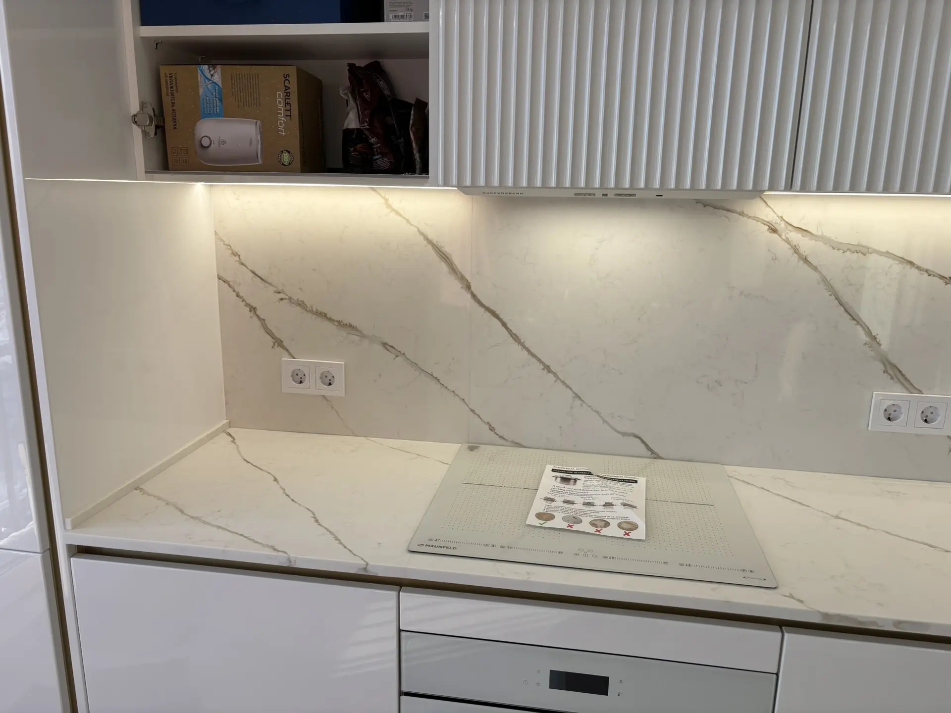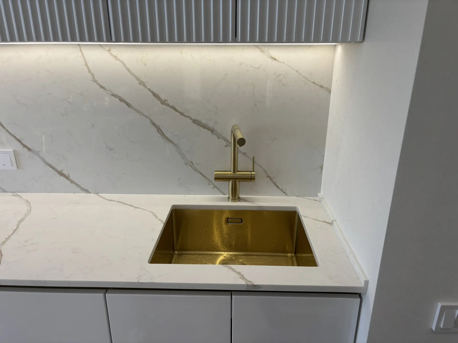 Столешница и стеновая панель из кварцевого агломерата Etna 002. Камень типа «Калакатта» (большие полосы идут по слэбу, а в изделии получается, что переходят со стеновой на столешницу (или наоборот)).