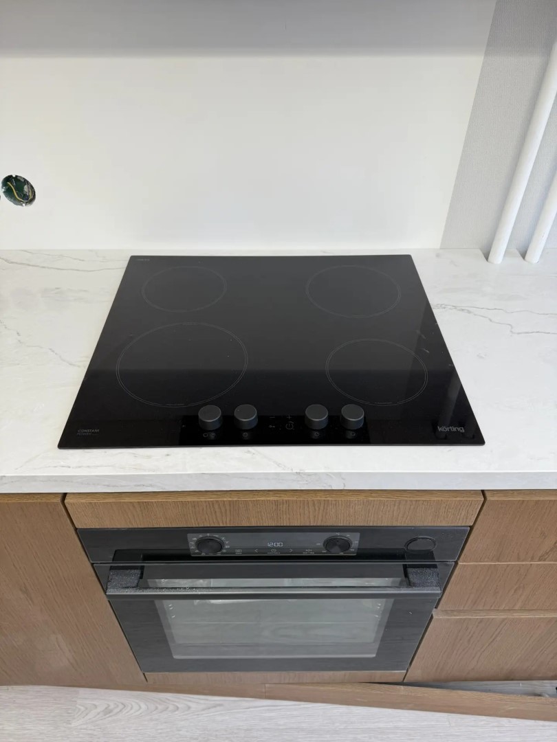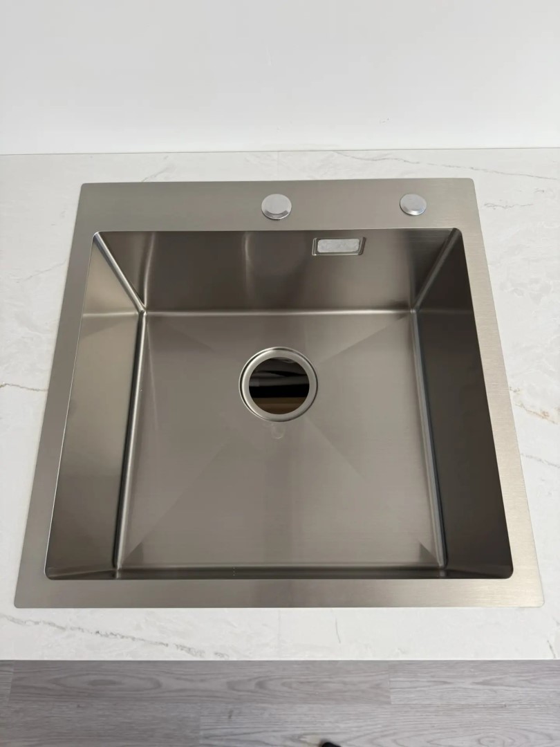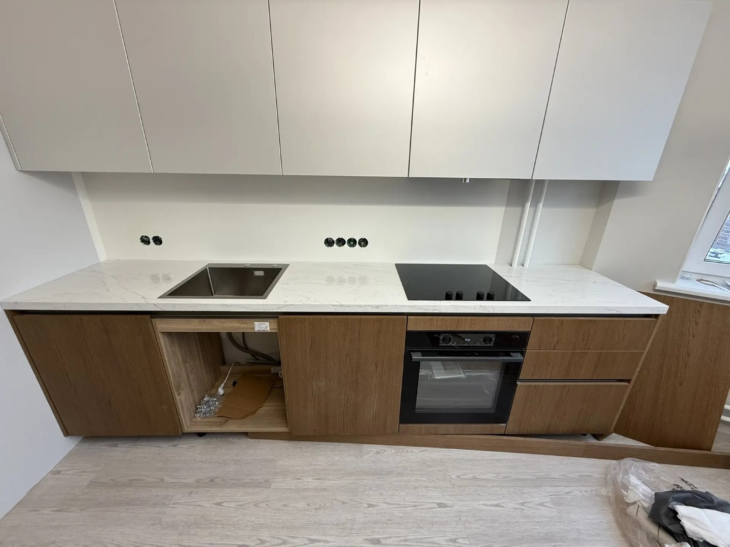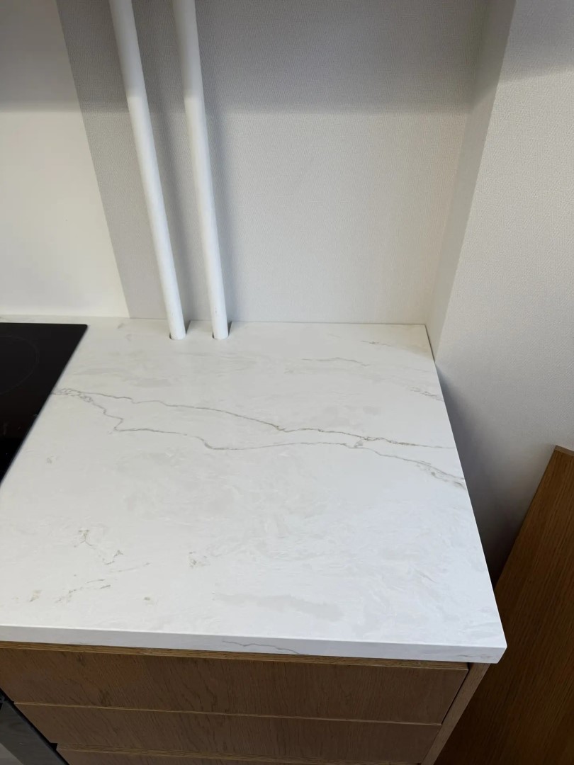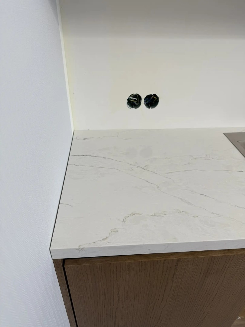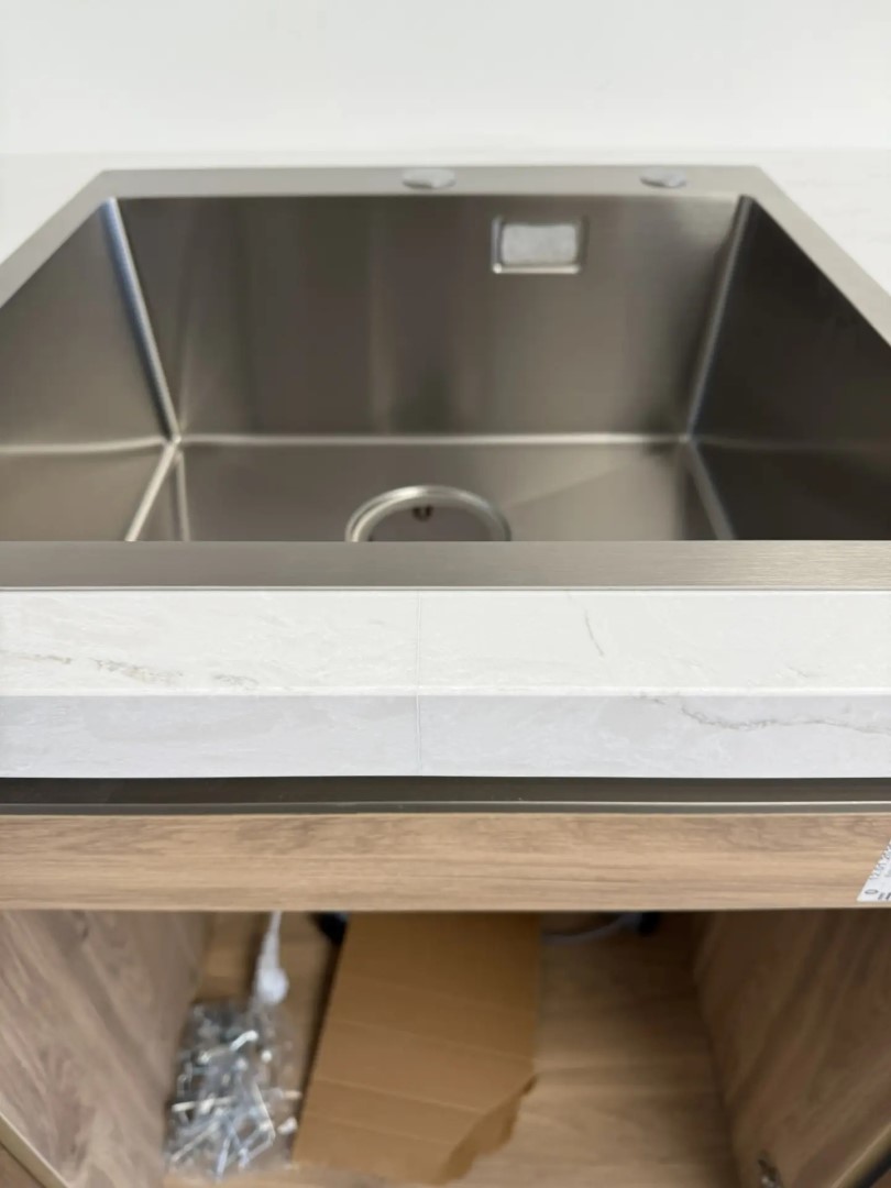 Столешница толщиной 20мм из вьетнамского кварцевого агломерата VicoStone BQ6702.Простая, но очень хорошая и функциональная мойка, которая лежит на столешнице.