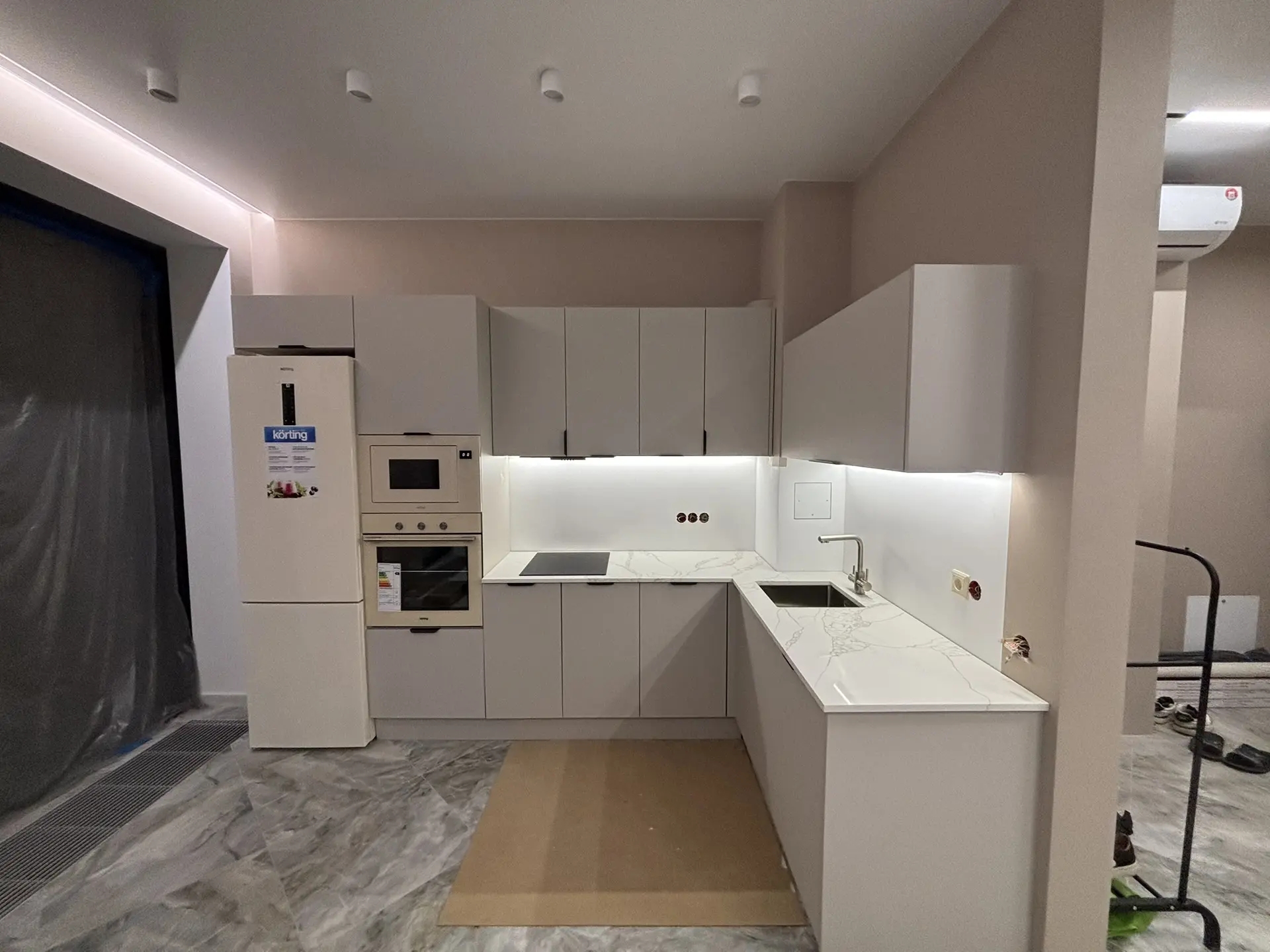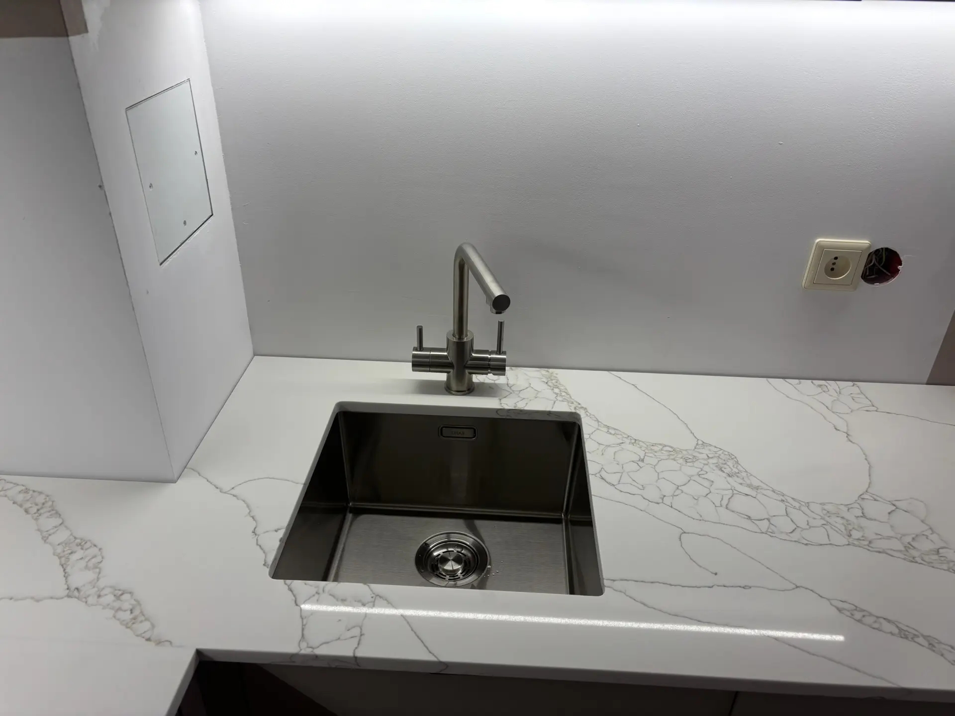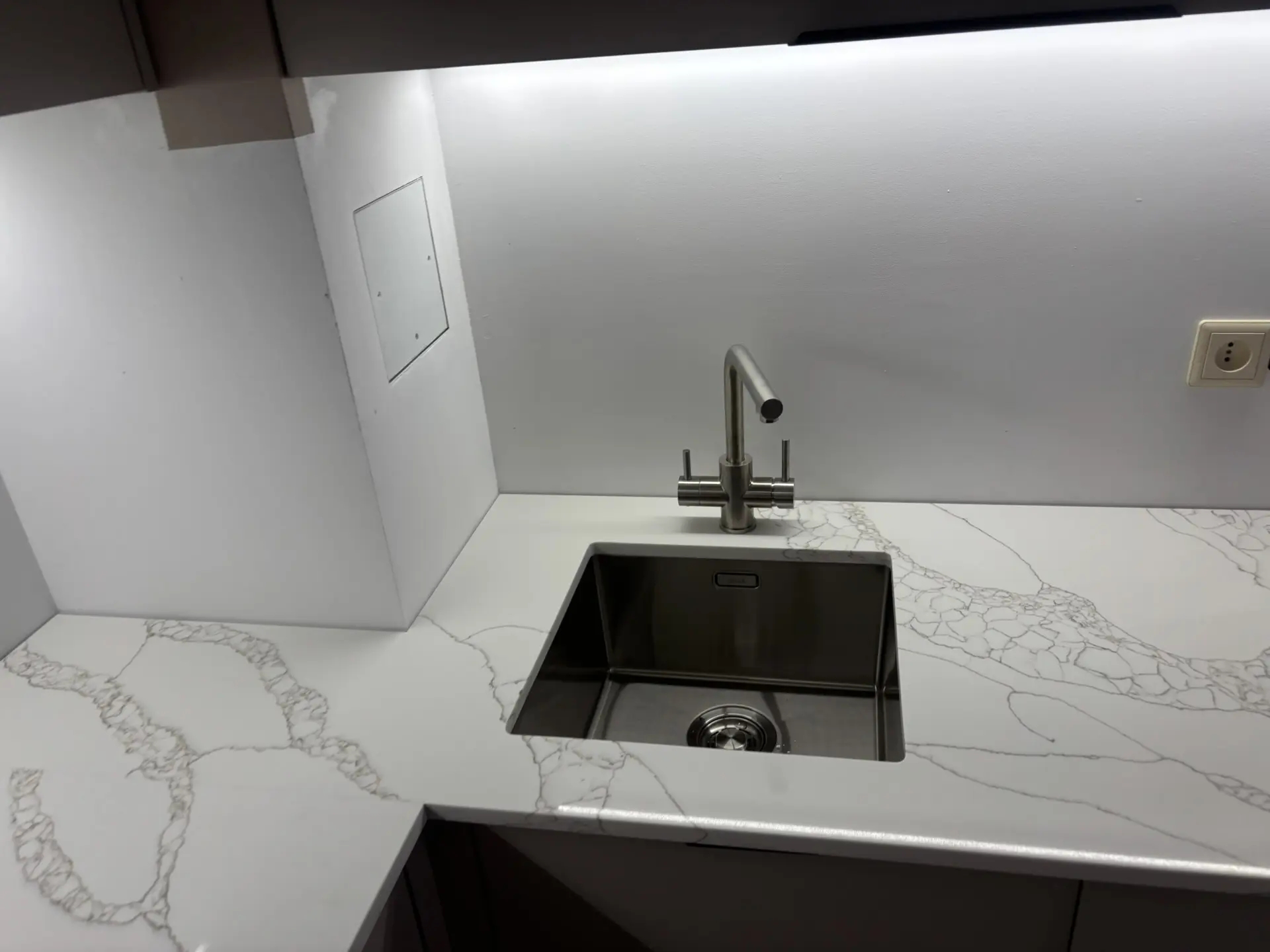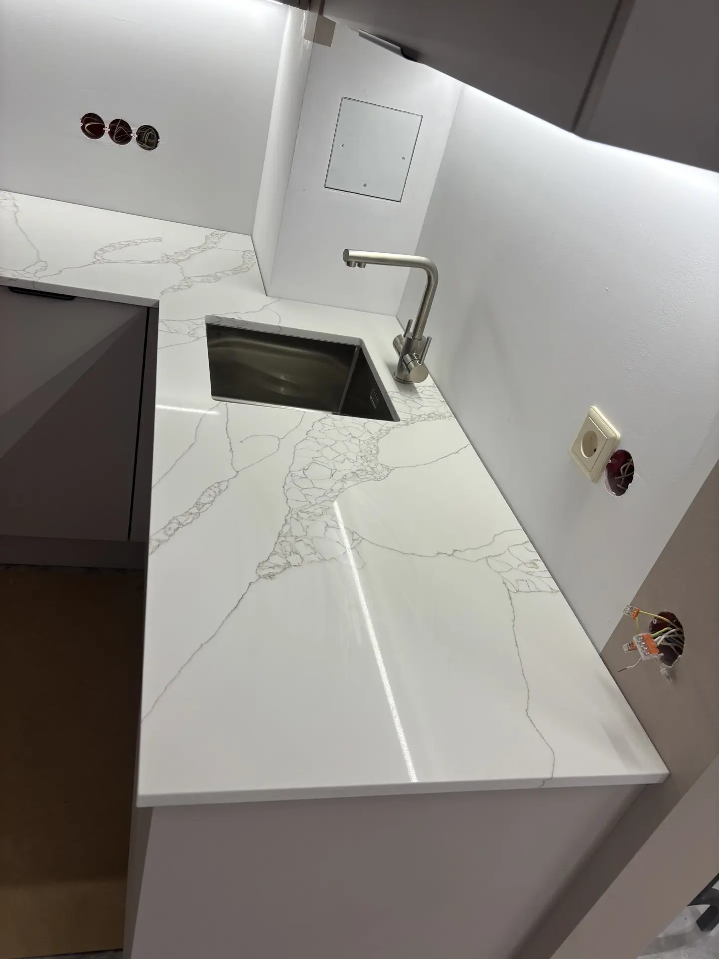 Столешница из кварца Avant 7470. Один из видов Calacatta.Хорошо получился переход на стыке, получилось почти соблюсти рисунок, хотя столешница развернулась на 90*