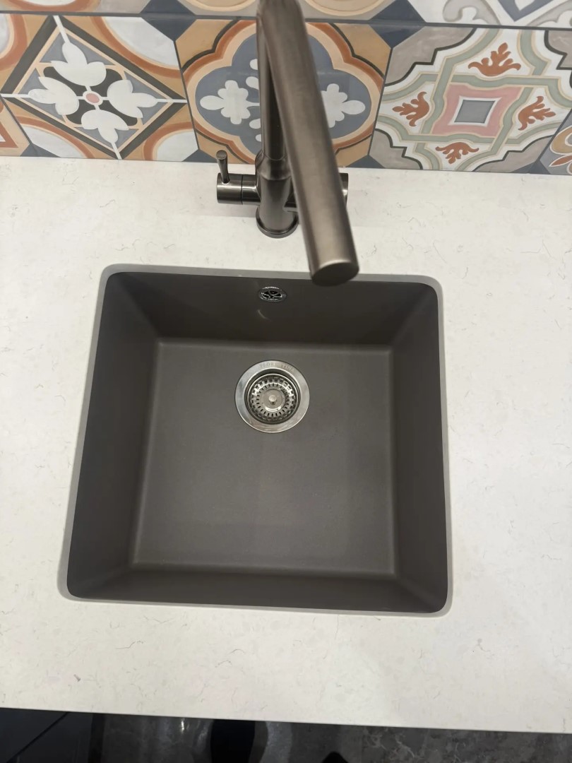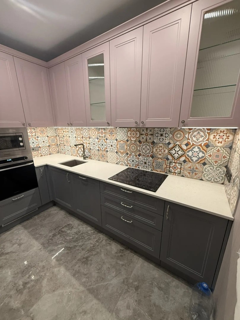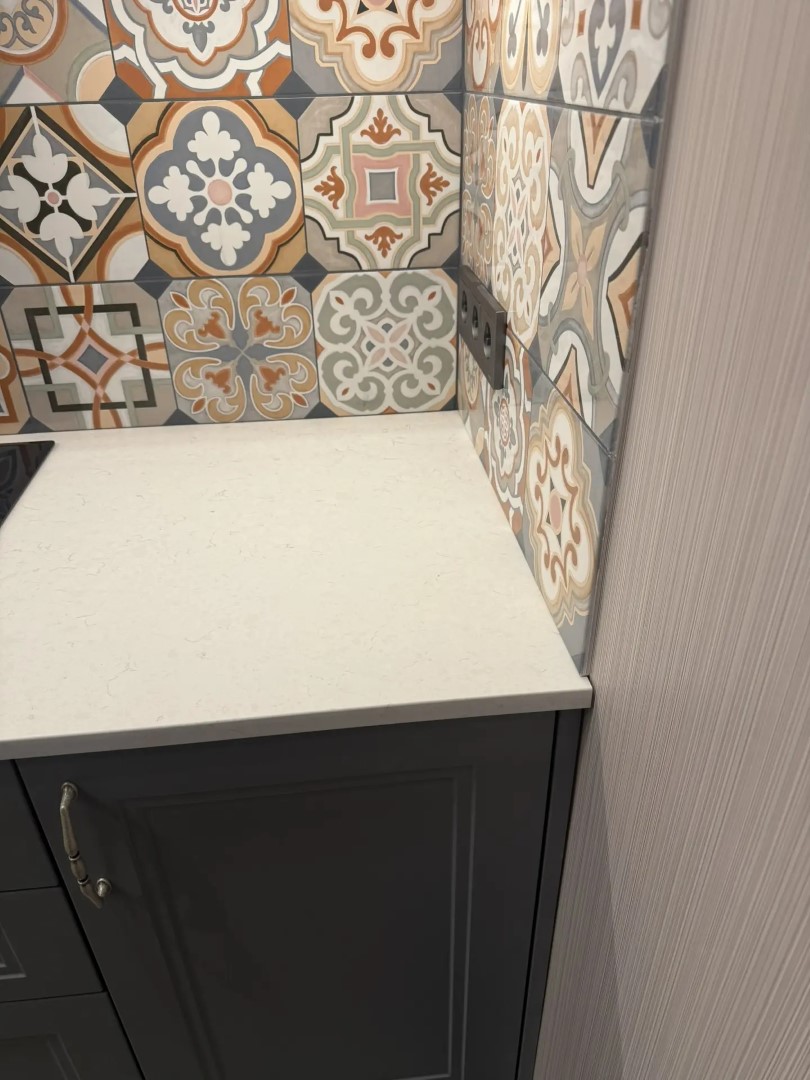 Ничего сложного, но был один нюанс: очень не хотели пристеночный бортик у плитки, которая была выложена не совсем по уровню. Разность составляла почти 5мм. Заказчики решили иметь столешницу такую же. Мы подогнали столешницу под плитку, ножками подрегулировав уровень. Результата достигли — плинтуса нет, столешница стоит и не бросается в глаза, что под углом. Получается, что сделали не совсем для себя, а для гостей — чтоб смотрелось интереснее..