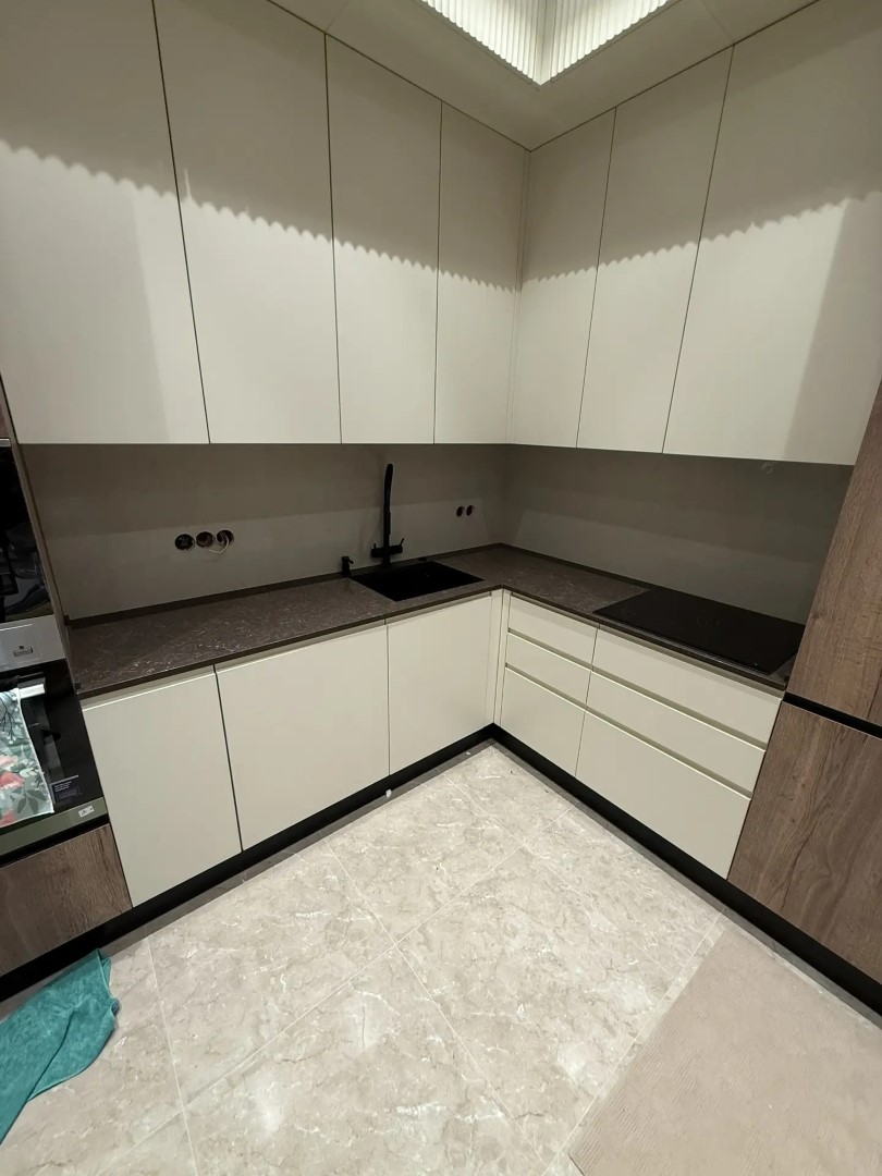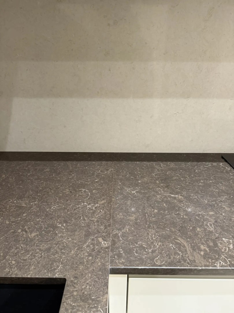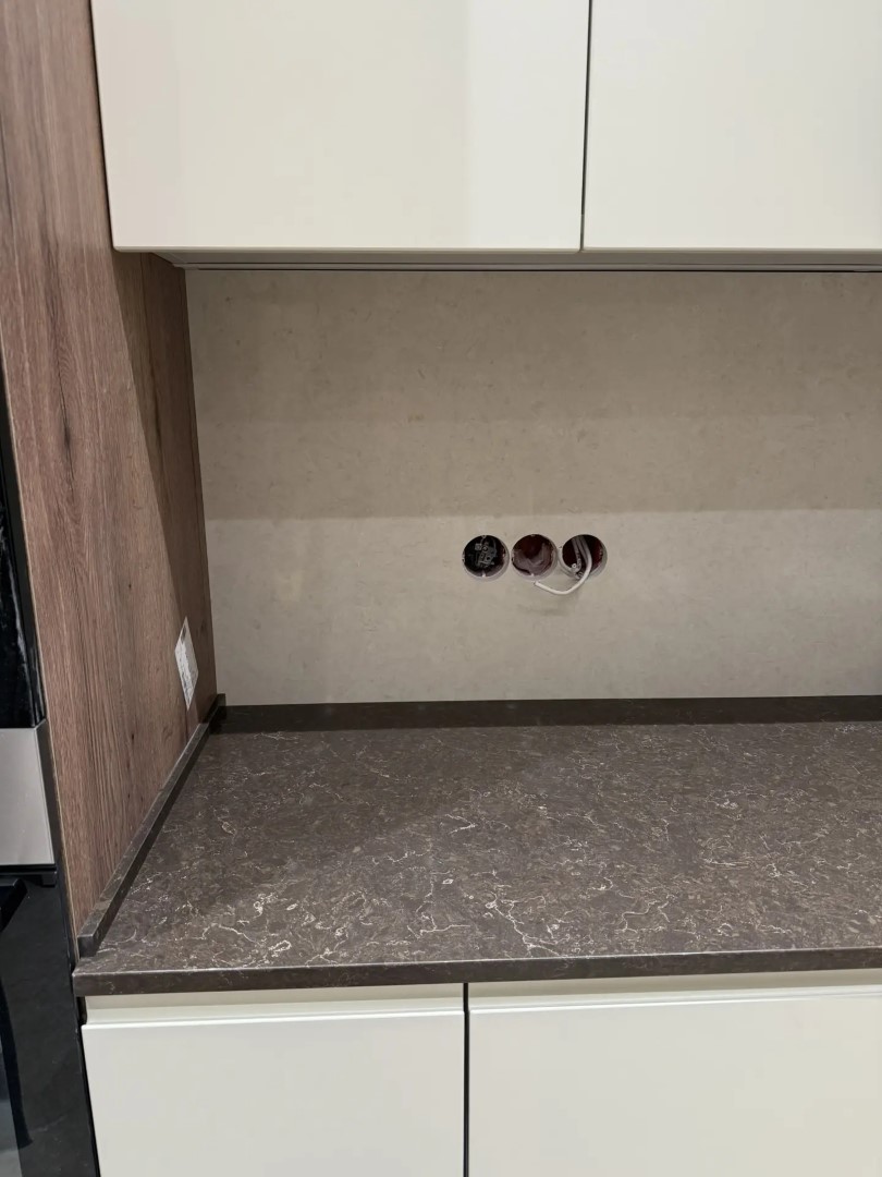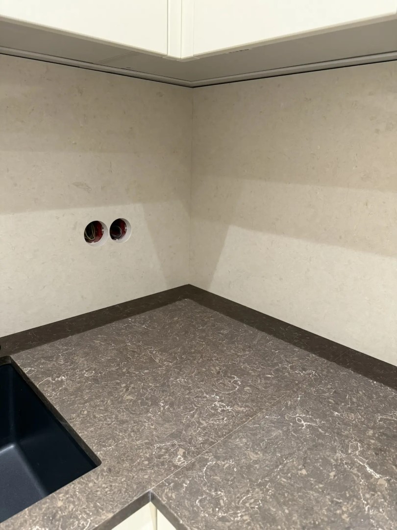 Здесь заказчик решил использовать 2 цвета. Столешницу из российского камня Аварус R538 Горы Кавказа, а на стеновую панель вьетнамский кварцевый агломерат VicoStone, артикул Taj Mahal.