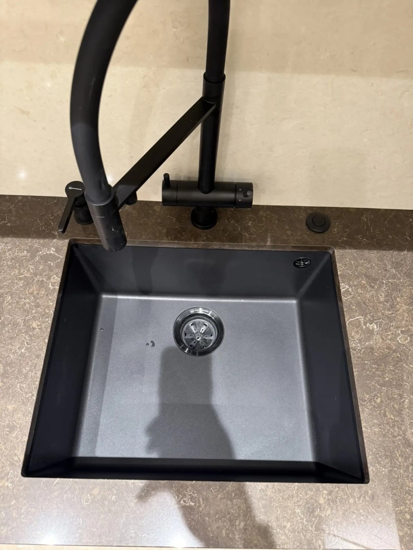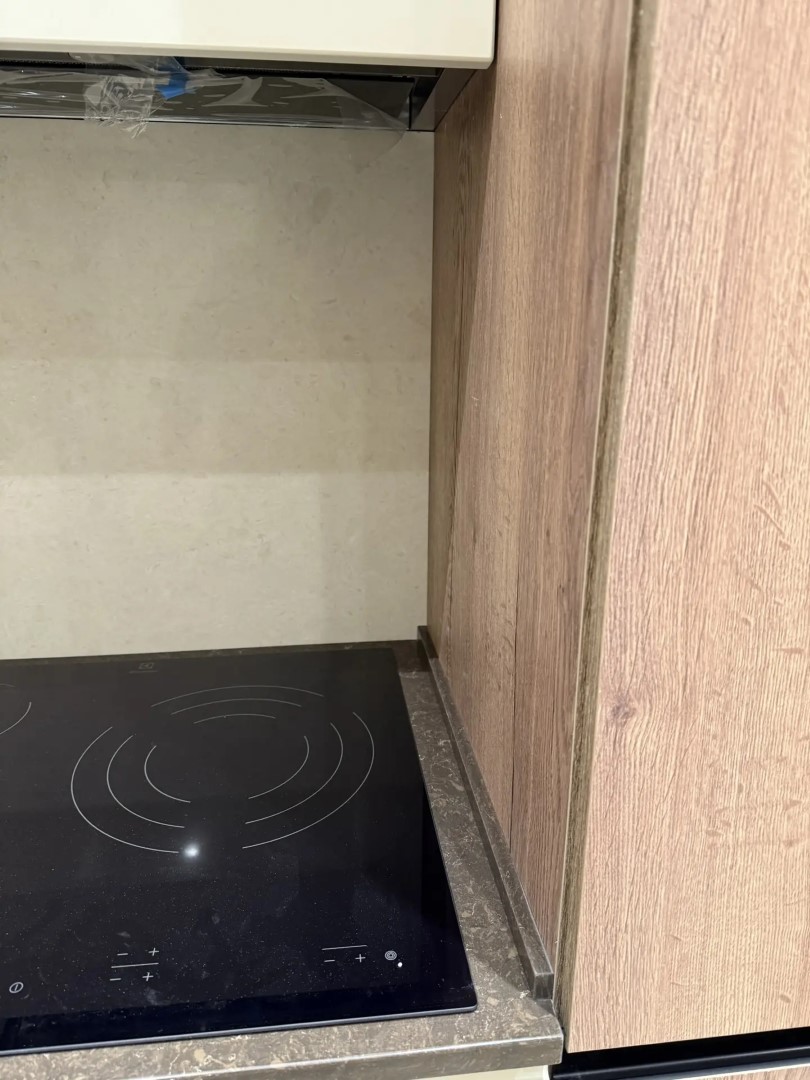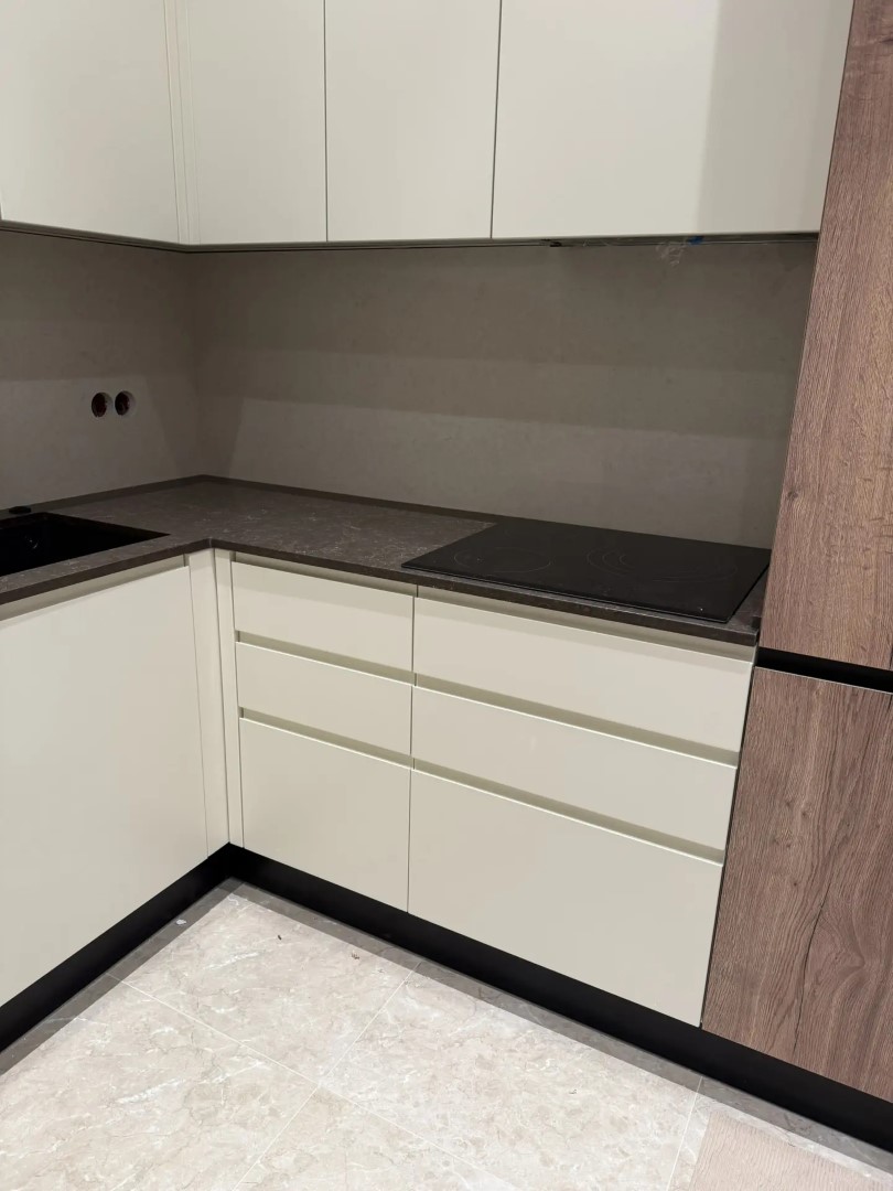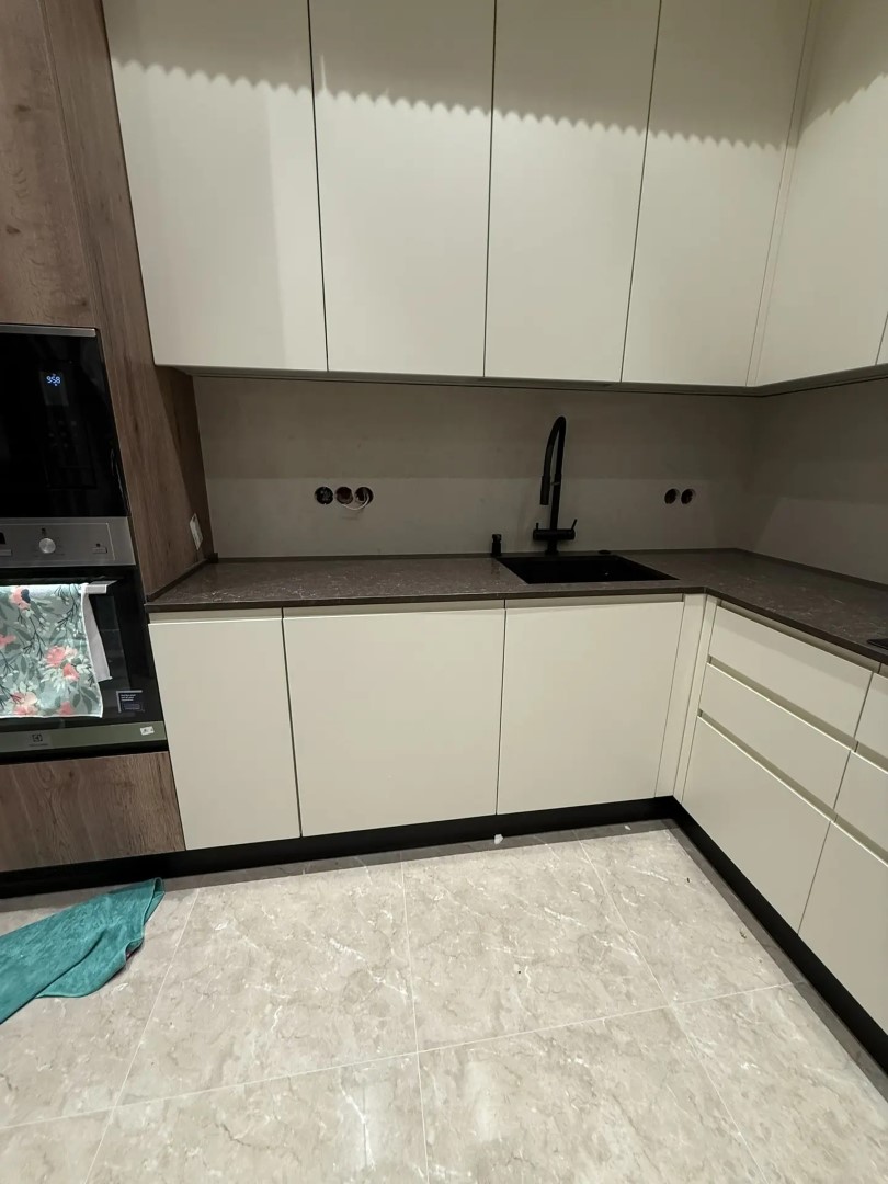 Здесь заказчик решил использовать 2 цвета. Столешницу из российского камня Аварус R538 Горы Кавказа, а на стеновую панель вьетнамский кварцевый агломерат VicoStone, артикул Taj Mahal.