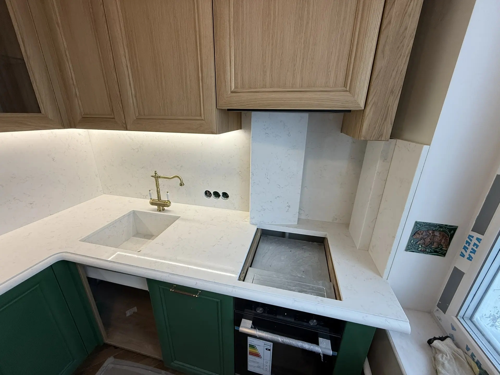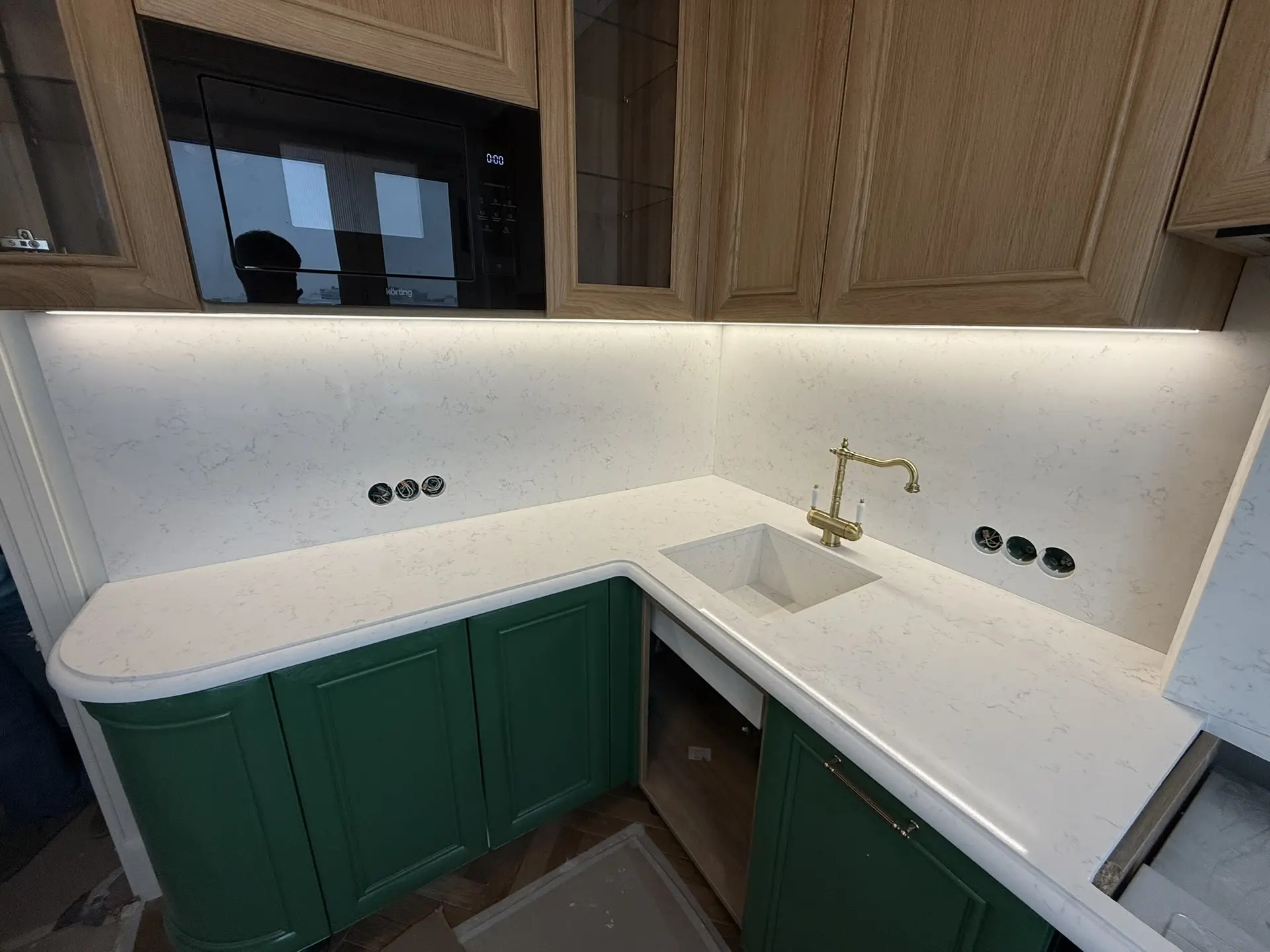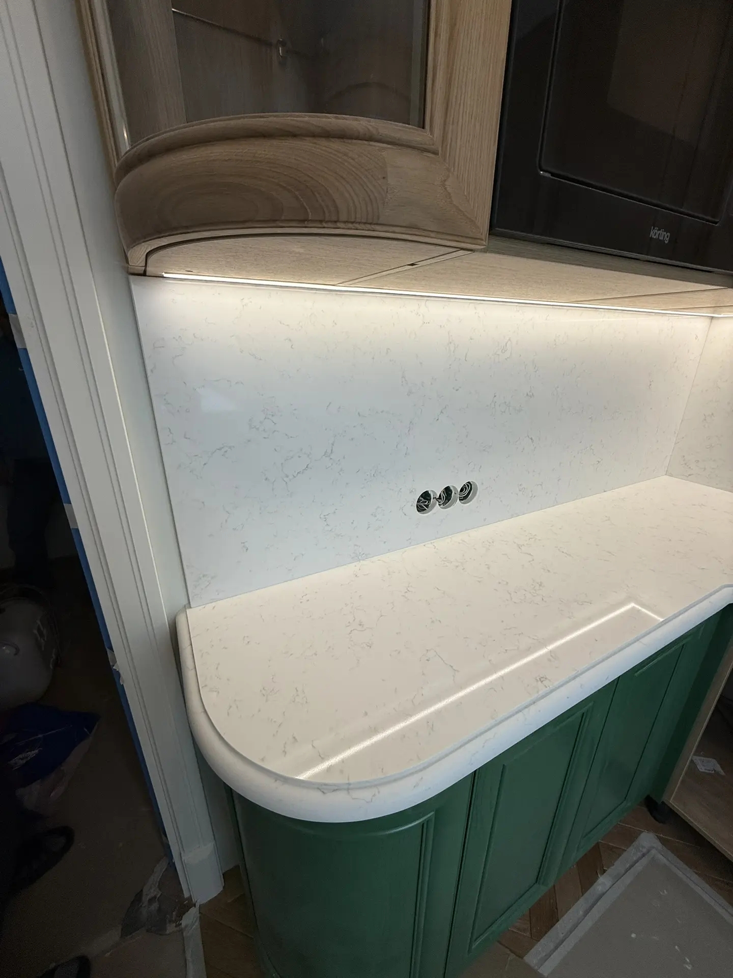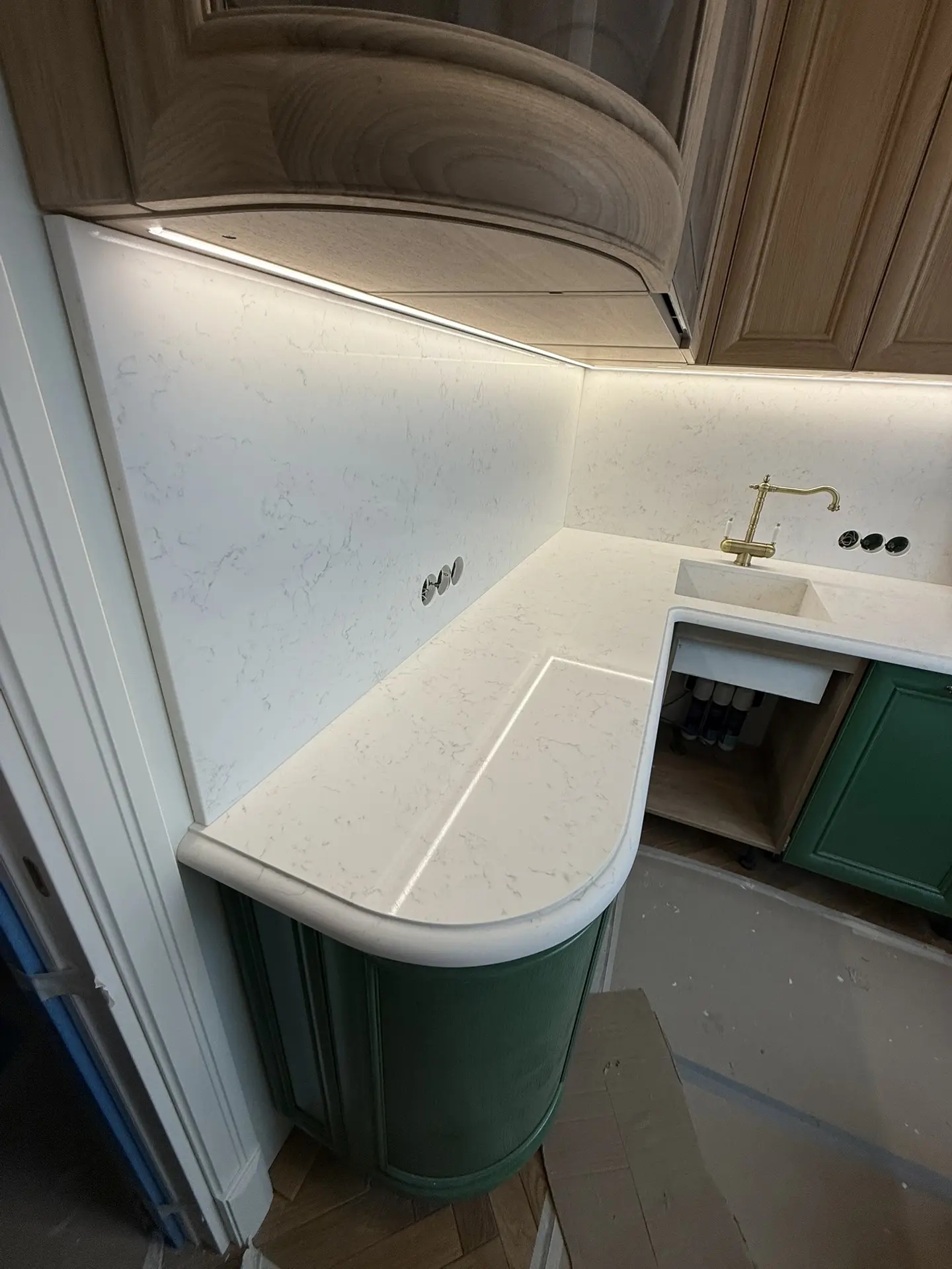 Столешница толщиной 40мм с фигурной фаской из кварца Primax 931.Стеновая панель + короба для скрытия труб из того же камня.А также интегрированная мойка.