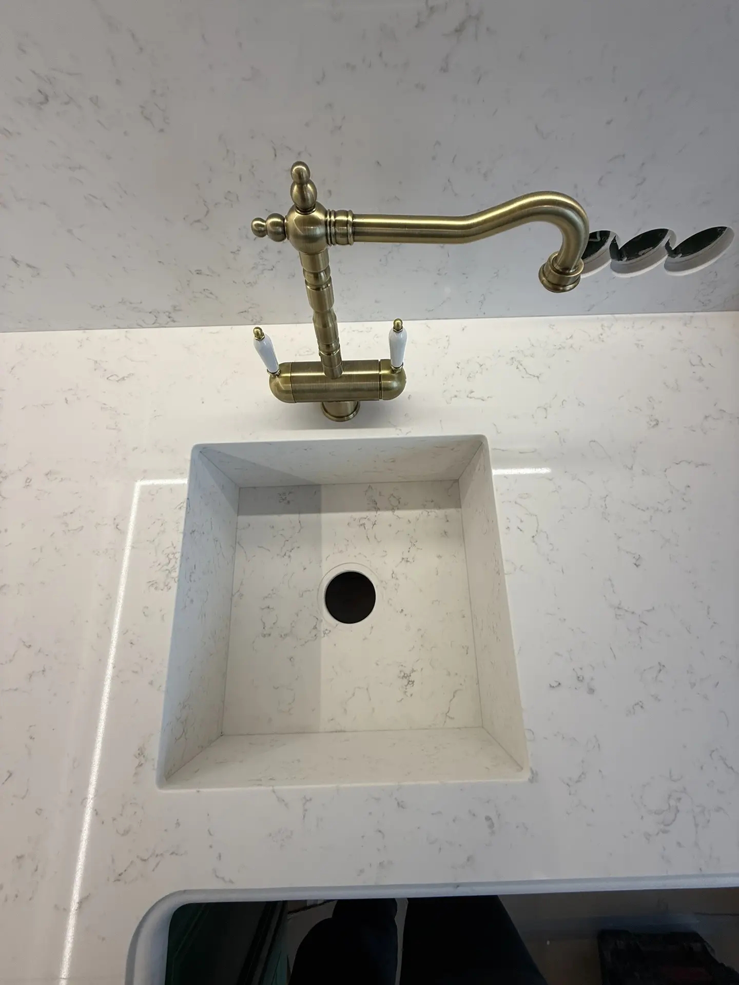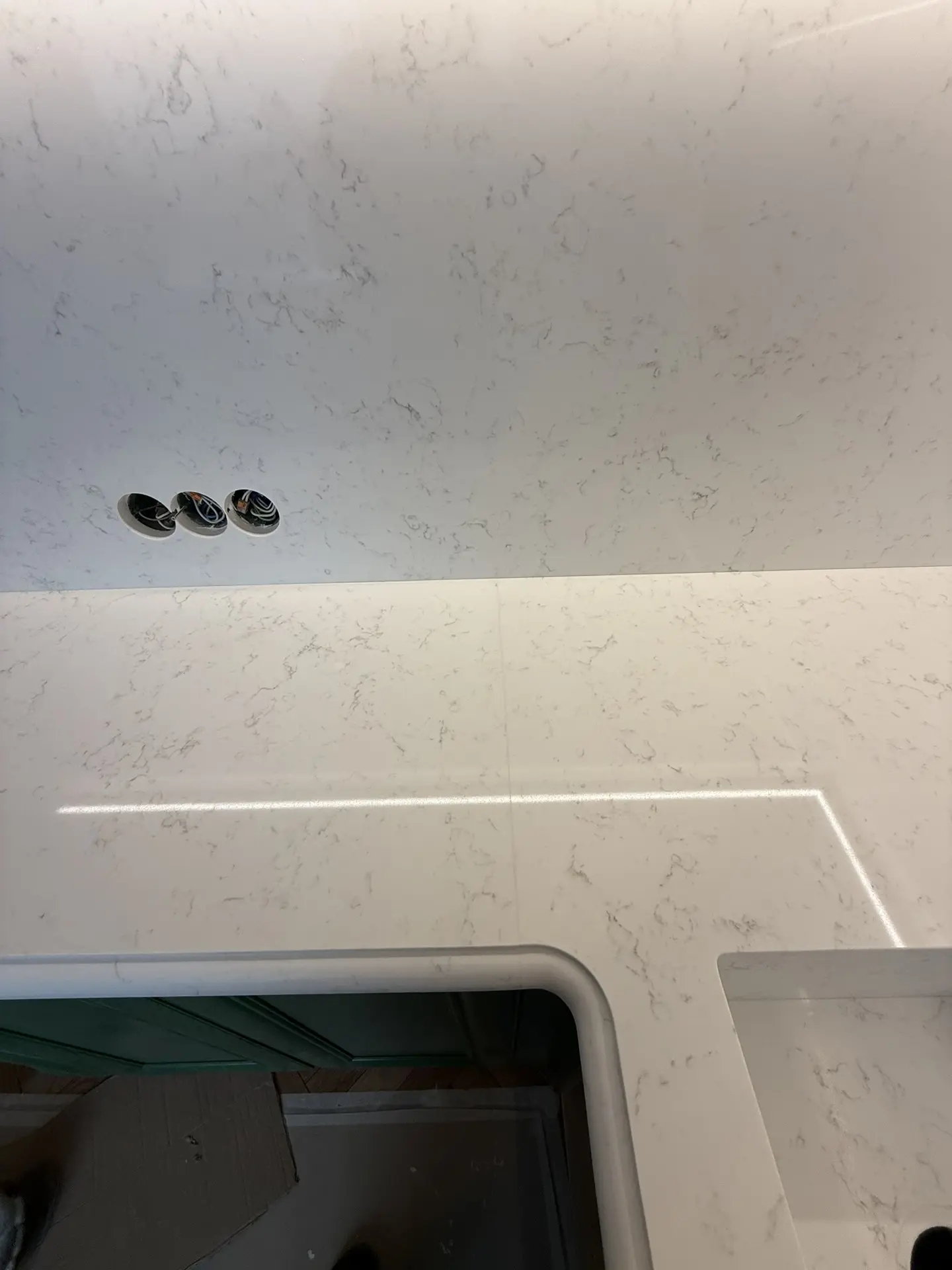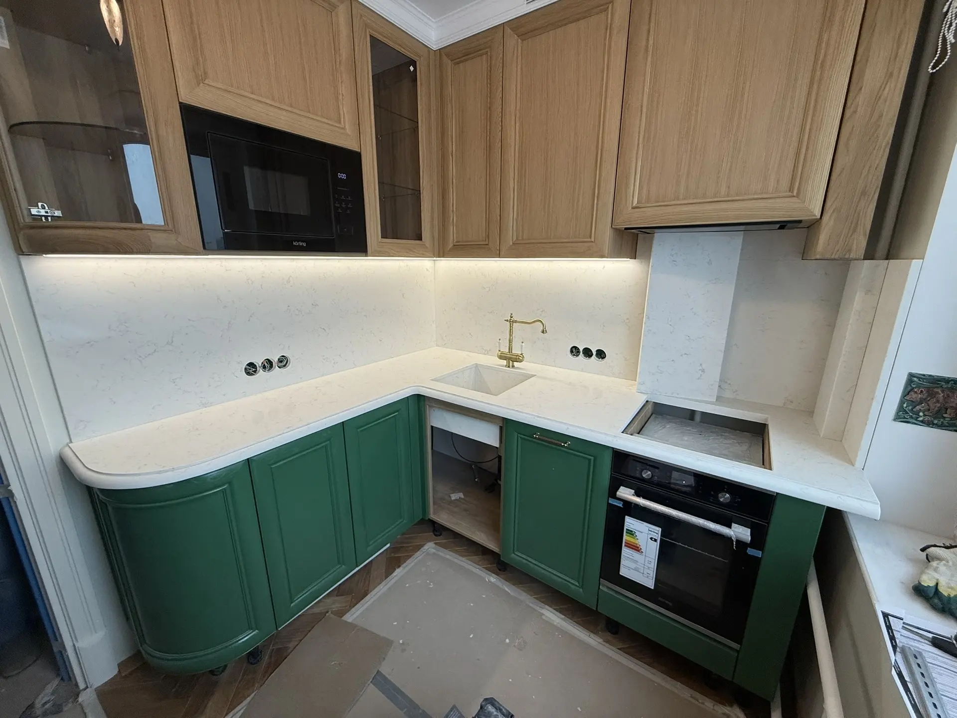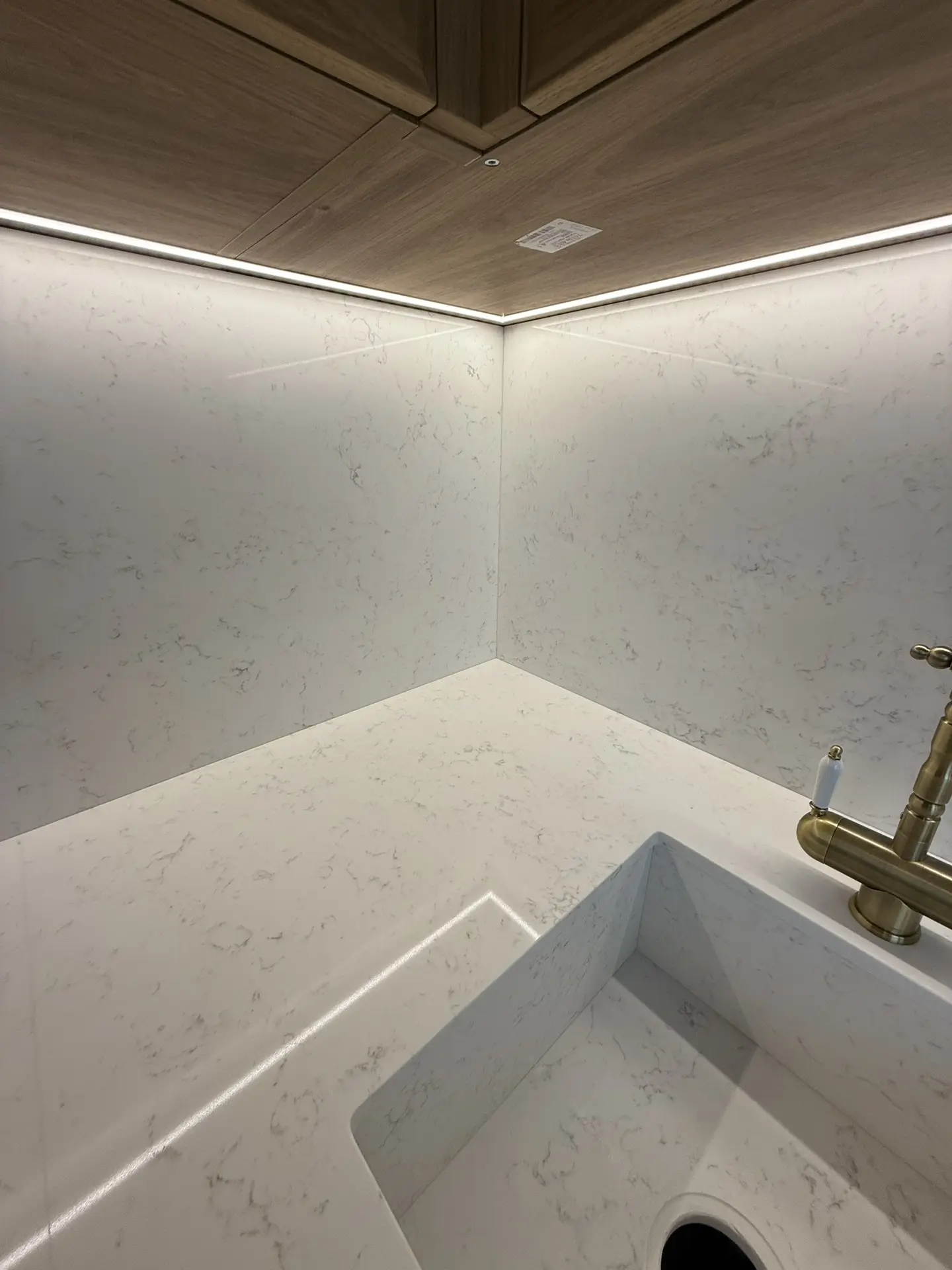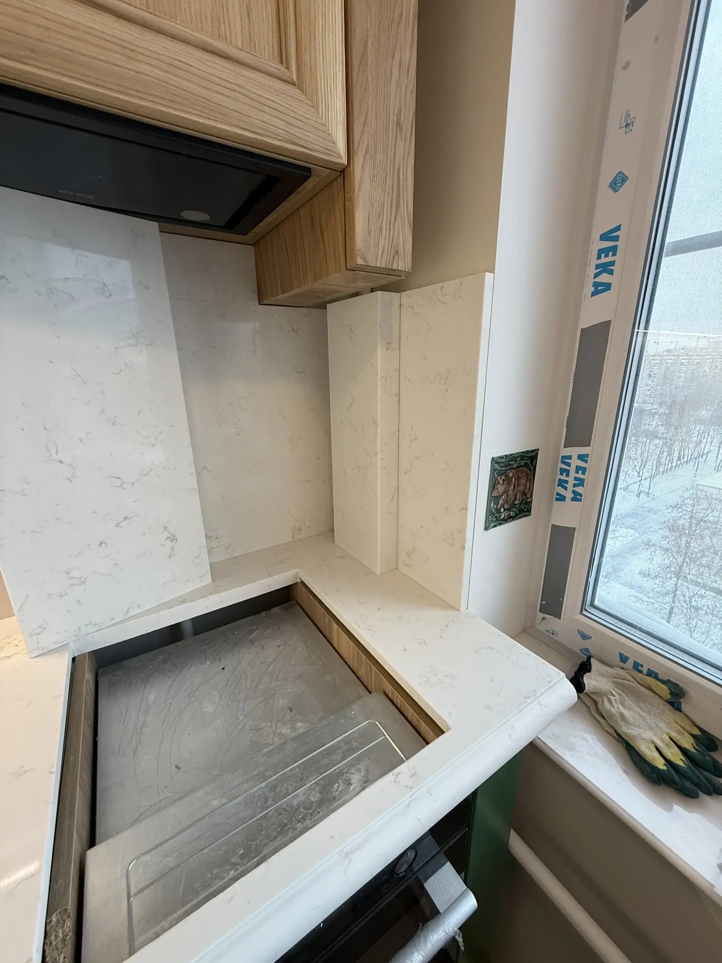 Столешница толщиной 40мм с фигурной фаской из кварца Primax 931.Стеновая панель + короба для скрытия труб из того же камня.А также интегрированная мойка.