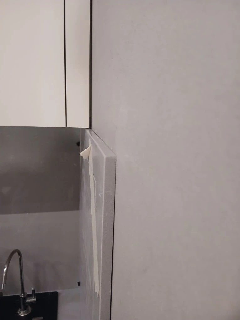 Столешница + стеновая панель из кварца Аварус R444 Ай-Петри.Заказчица после установки попросила сделать сбоку из того же камня люк с обрамлением. Что и было сделано